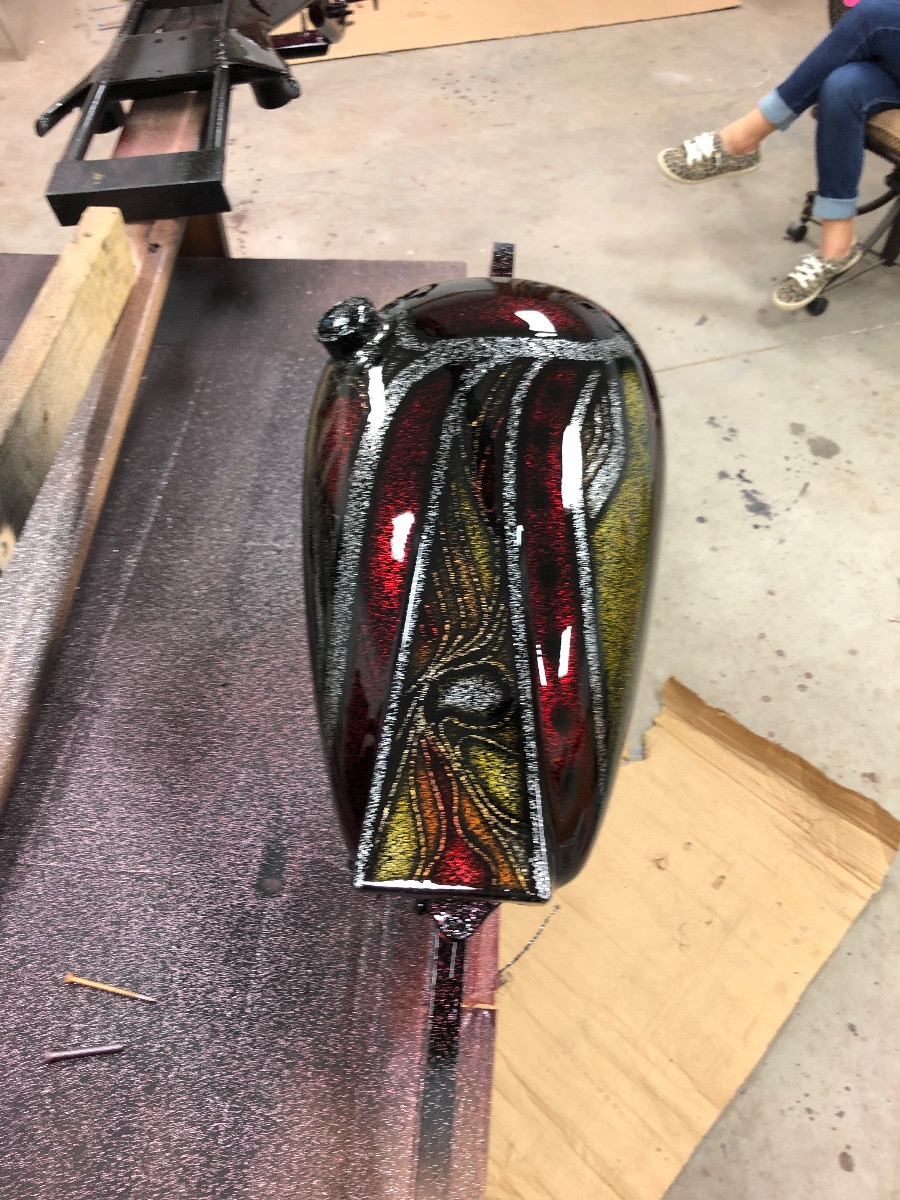 Ha Ha ... I got shades man. I was going for all in ,over the top and ...... well....... I decided to do huge chunks of gold leaf thrown down over some areas of the brandywine. Also another brandywine coat was laid before the clear/flake. I started to knockdown the gold leaf chunks ,before I lay some gold leaf lines to tie it all together then airbrush touchup all of it then final clear.
