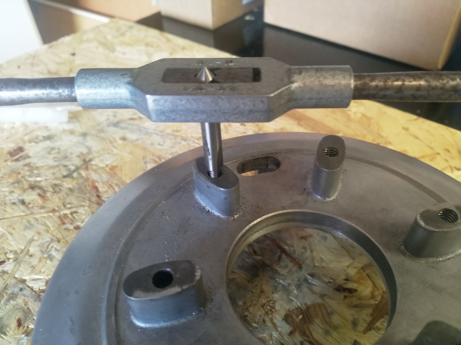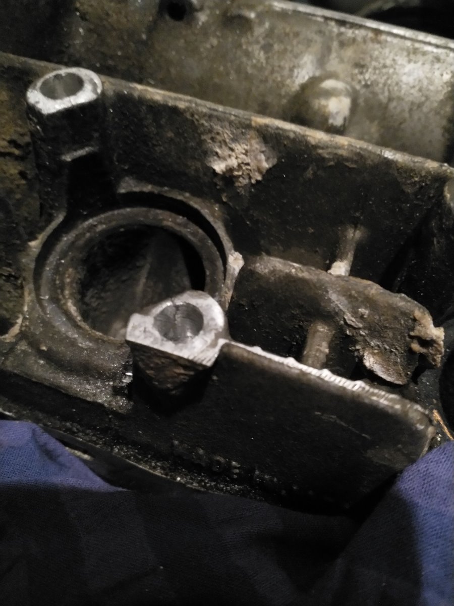 Here are some photos of the repair I had to do on two of the exhaust stud holes. They split when I was extracting the bolts (got 6 out with heat and patience, two of them just wouldn't come out). The first photo isn't very good but you can just see the hairline crack. Ground out the side walls with a dremel and got a local guy to weld them up for me. Then spent lunch time at school in the woodwork room throwing together a rig for the drill press. Used some long 6mm threaded rod to make sure the holes were in line. Studs ended up perfect when I put the exhaust on.