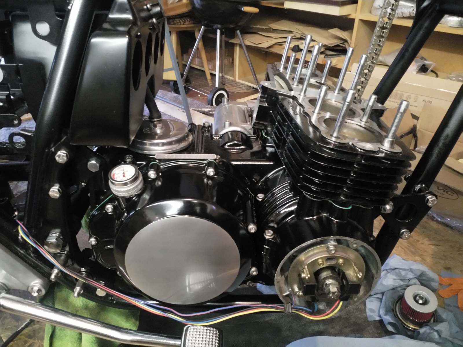 Getting the clutch, alternator and pickup coils back in. Also put my nice shiny breather cover back on.