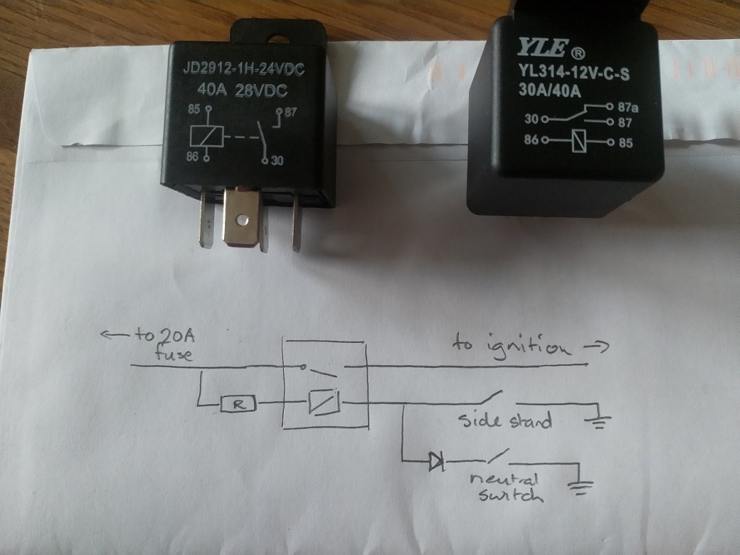 Here is my wiring diagram and the two relays I still have lying around. I'll use the 24V 40A one to be on the safe side. I'm not sure at the switch voltage for the relay and if I need the resistor or not. I was going to knock it down to about 3-4V but I haven't measured the internal resistance of the relay yet so I don't have any numbers.