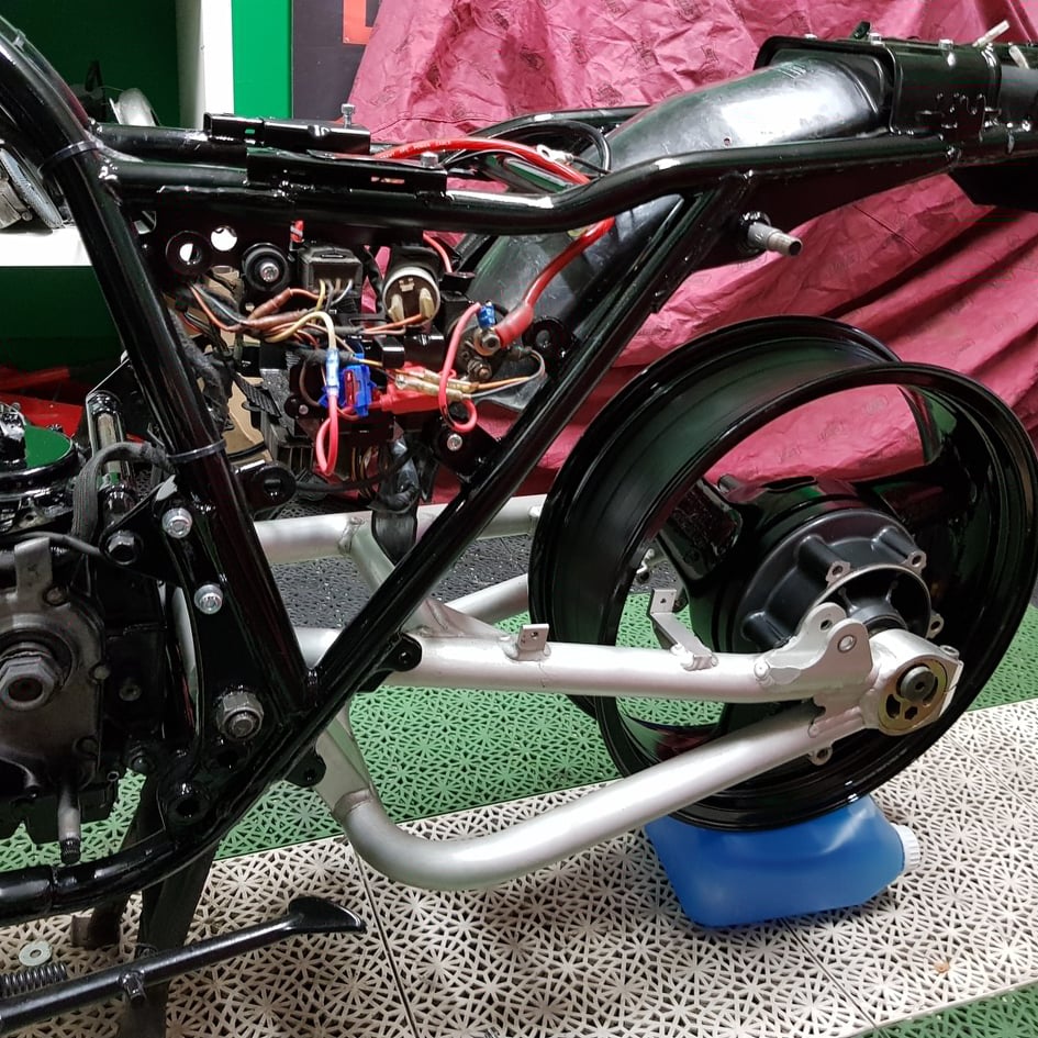 First of all i strippe,d the whole bike and sanded it, and then i cut away all brackets on the subframe that shouldn´t be in use. Painted the frame and engine in gloss black.