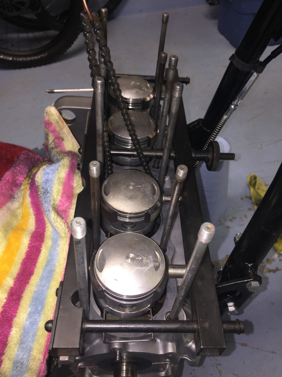 Thanks for the pictures. Thinking back on my decision making process at the point of installing the pistons one of the issues was that I didn't have the original support wires and was trying to figure out what to use in their place. The skirt on the bottom of the Weisco pistons was also different than the stock pistons and like I said I didn't want to damage the new pistons messing around with something I didn't fully comprehend. It's not an excuse, but I was also working on this project in between other job assignments I had so time was a real concern for me. If there's a "next time" perhaps I will try to use something like brazing rod to sneak under the pistons and hold them in place. The tool I have is for the 1000 cc pistons. I did learn that a good chamfer placed around the bottom of the cylinder sleeves is critical for easy piston installation.