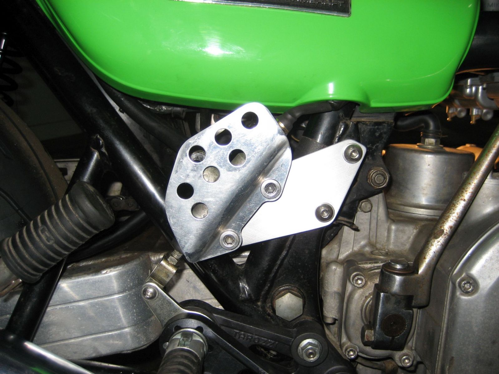 For the rear MC i made a bolt on aluminum adapter plate for my Tarozzi foot rest with a direct linkage and a hydraulic brake light Switch for the Banjo bolt.