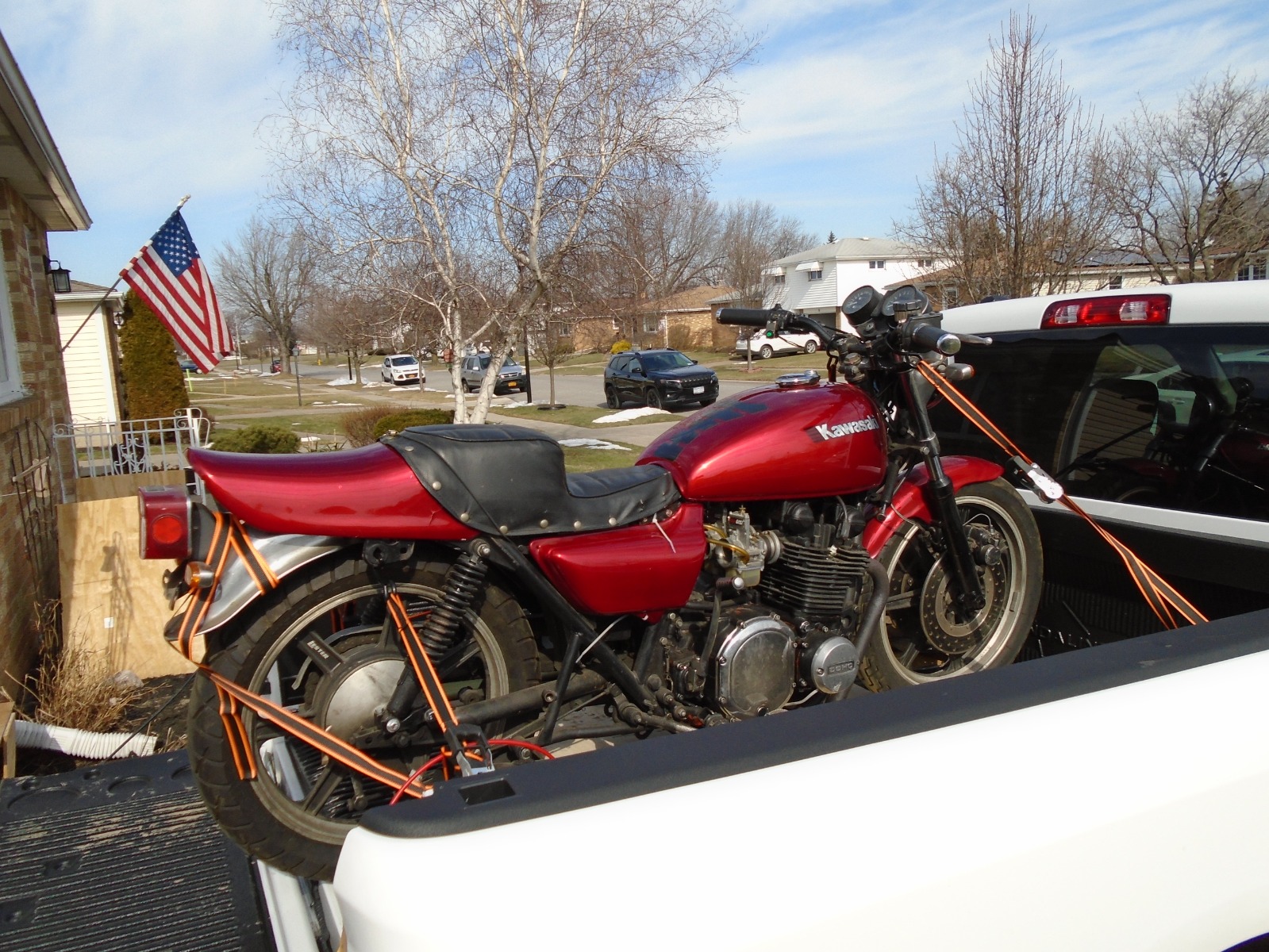 Hi DO, This is a new project. I just got it off my truck yesterday. The bike is a hybrid of parts. Title is a 77 vin. "B" LTD frame. It has 76 LTD front dual calipers. Drum back, seat latches were cut off for that fiberglass short rear cowl and seat. Now I just seen the engine #s The engine is a 75 Z1B, Z1E-057406. Someone might need that # for a resto? I am in the thinking and planning stage.