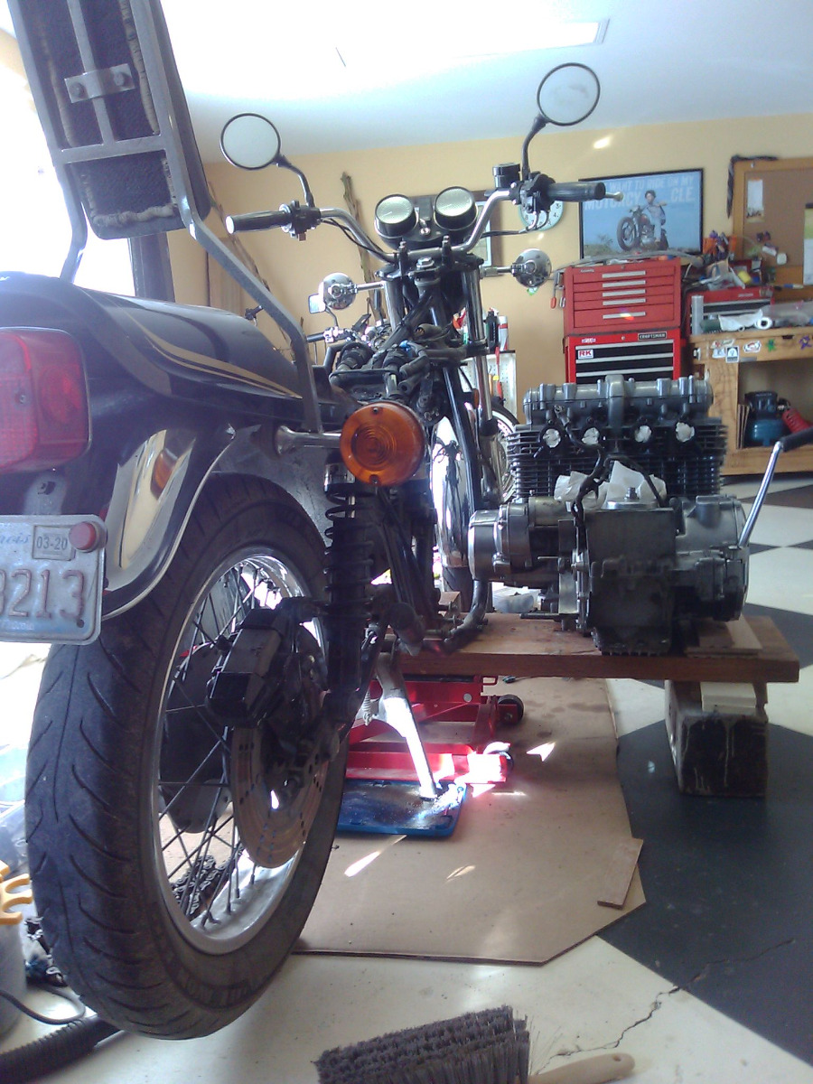 I had a KZ1000 motor shipped from a friend. It was on a 2x2 pallet and rested on an old tire to protect the motor. I mounted a cpl brackets for auxiliary fuel tank battery etc. Roll it anywhere around the shop. Worked out awesome. For a mobile engine stand...and cheap too. Parts on hand. Wheel it up right next to the bike when ready and lift it right in. Just a thought.