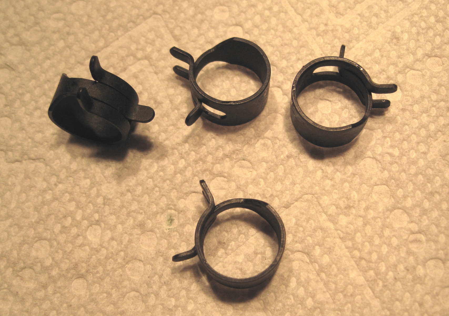 For fuel hose I use Goodyear 5/16" Fuel Hose SAE 30R7 (required 8") Part # 65123. For clamping the hoses I use 5/16” spring clamps. They are a million times easier and quicker to use than the screw type. Some auto stores sell them or they can be easily found on eBay.