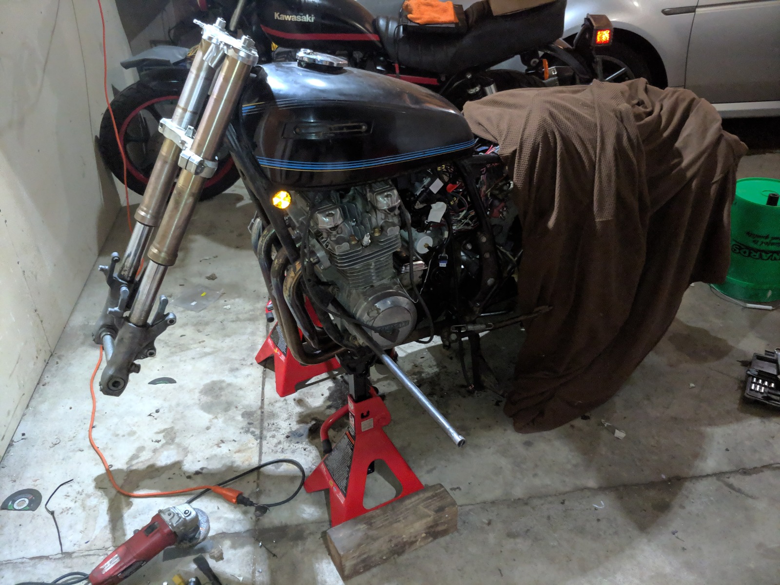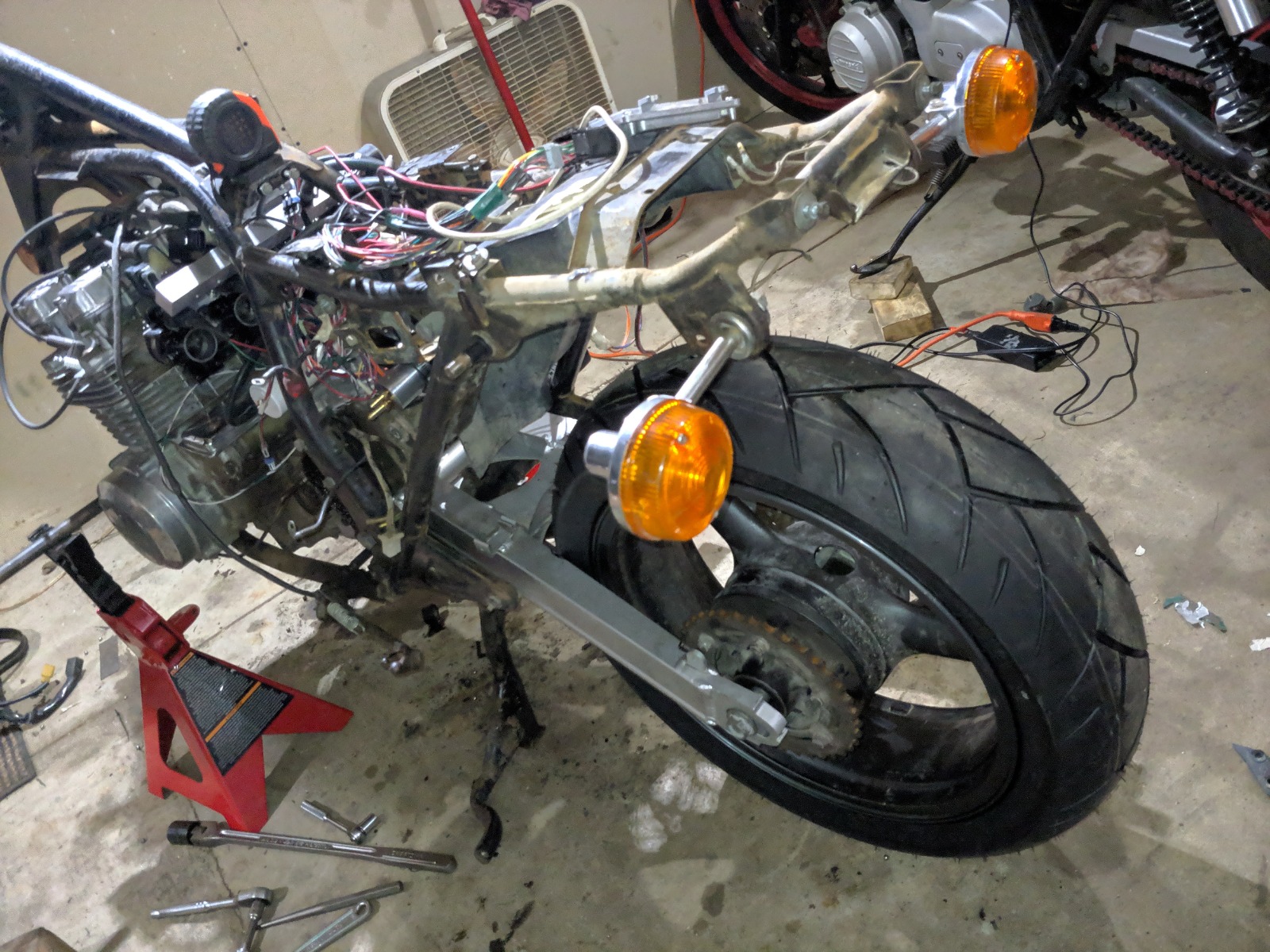 Zephyr 750 shocks installed. ride height is pretty good, but the front forks still need to be extended 20mm.