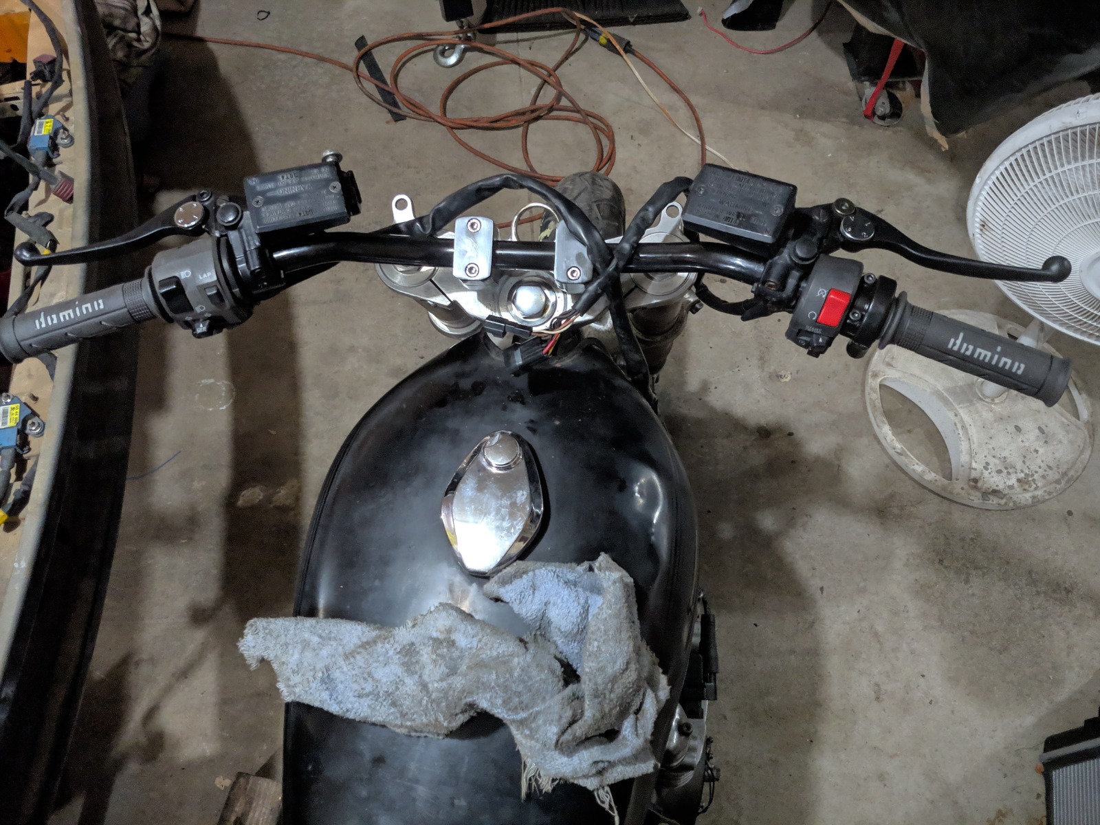 05/06 ZX6 controls. Zx9r front master and clutch master. motion pro throttle with a super slow ratio for my massive TBs... lol. Emgo supersport bars. Also had the welders at work reweld my triple (both sides of the bushing) and milled it again with a nice chamfer.