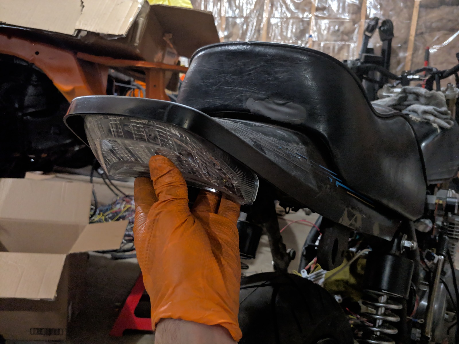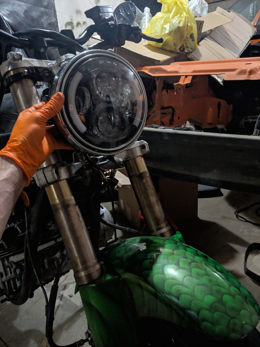 Pieced together the headlight assy. that led light though :woohoo: I bought some fork clamps and am making some prototype 3d printed brackets as i write this post. Got the front fender installed as well. Holes had to be relocated 10mm further apart to match the zx9 forks with the zx7 fender.