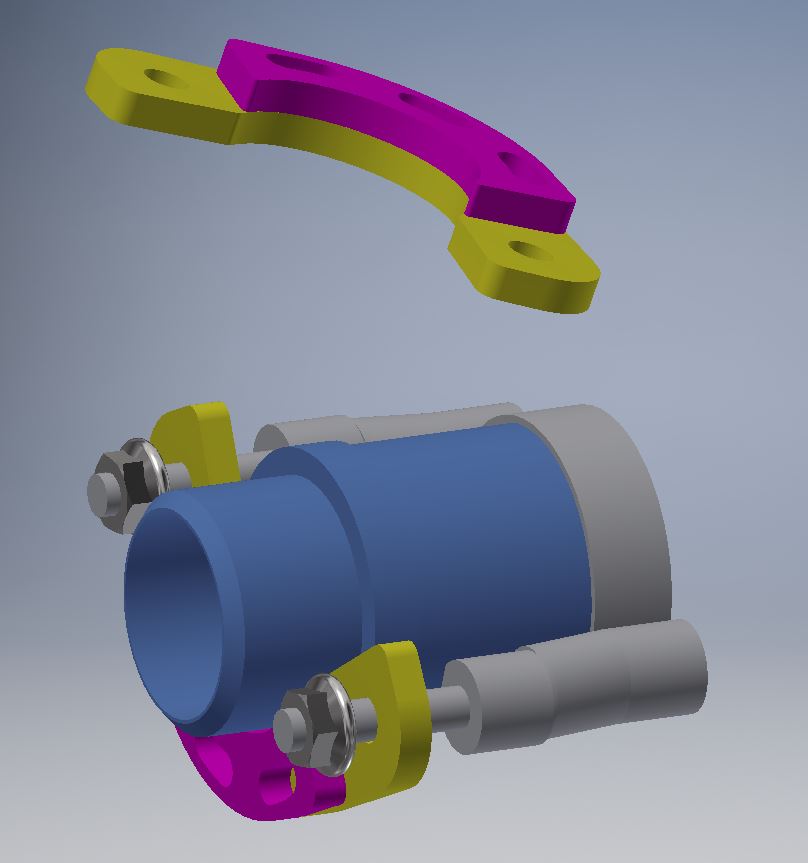 I saw these neato half clamps that a 750turbo guy made....grey part is the kaw cylinder head, blue is a machined piece that mates to the head and is clamped on by two of the yel/purp assemblies.