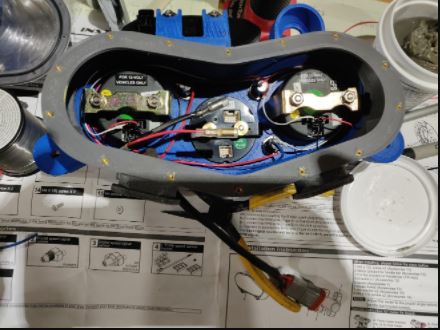 Backside of the gauge cluster. These are just power wires and fuses. The boost pressure sensor actually goes in here too because the sensor wasn't waterproof... so there's a little vacuum line going into the back of this cluster. It should hold up otherwise I can pot the sensor and move it under the seat.