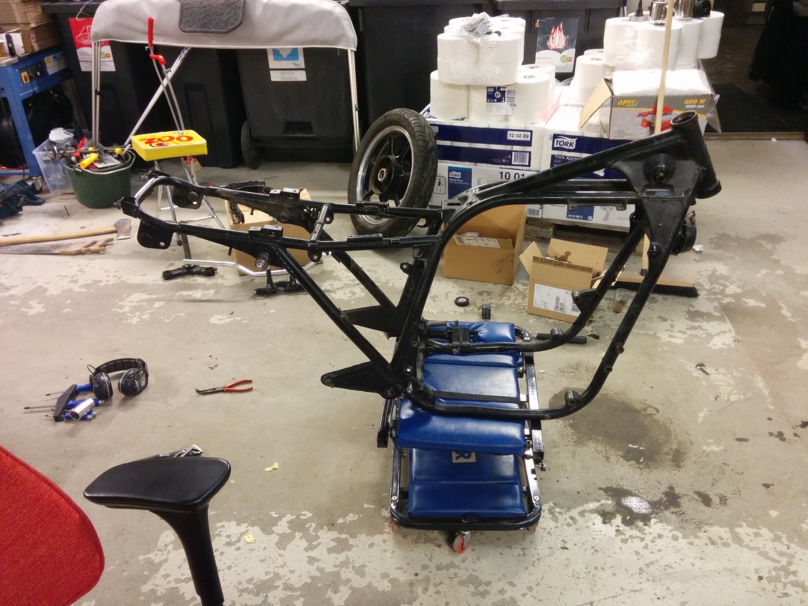 ) . Now I'm out of Uni and have I have collected parts for the bike for a year or so.Since I started the goal has been to have same size wheels to get that nice symmetric look. This has become something of a must have for me and since the project have been on and off for so long I feel no stress getting it on the road, instead I feel good about things taking time. I now have a permanent shop space and even tough I have owned 5 bikes in three different countries I don't have a licence for Sweden yet so no stress getting it on the road.