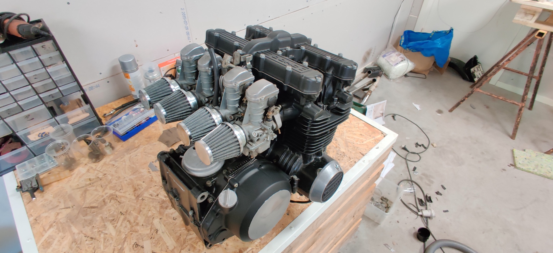 2015 - Another year just slipped away.. I did clean the carbs (at that time I thought they were clean). Scraped all of the gaskets off, reseated the valves and then left the motor all open in my garage.
