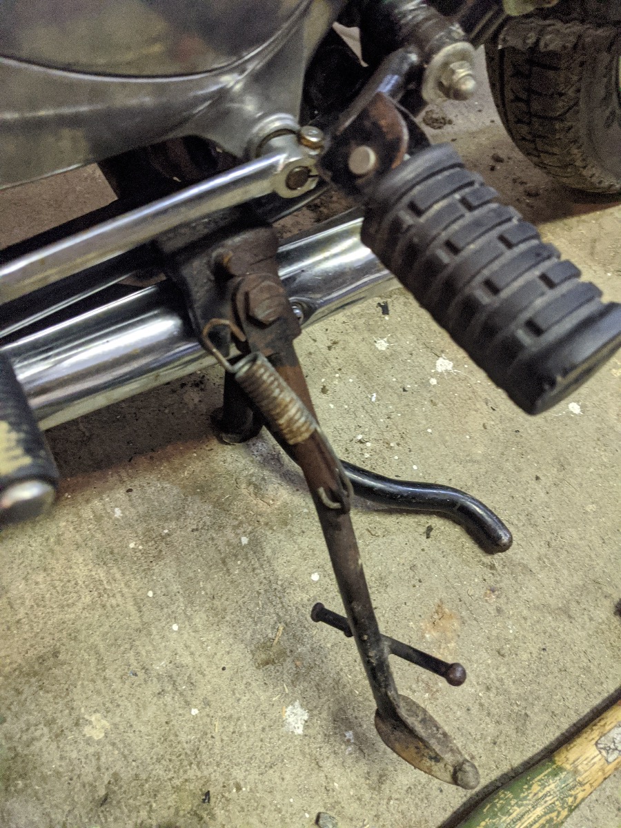 Battery box and center wiring harness mount thing was all rusted up, so I cleaned it up and repainted them, along with the horn, side stand and probably a bunch of other parts I’m forgetting. You can see the center stand stop I bent up in the photo of the painted side stand. Eventually, this whole bike will end up getting torn back down and powder coated, so I’m not after perfection right now. Just want to stop the cancer from spreading.