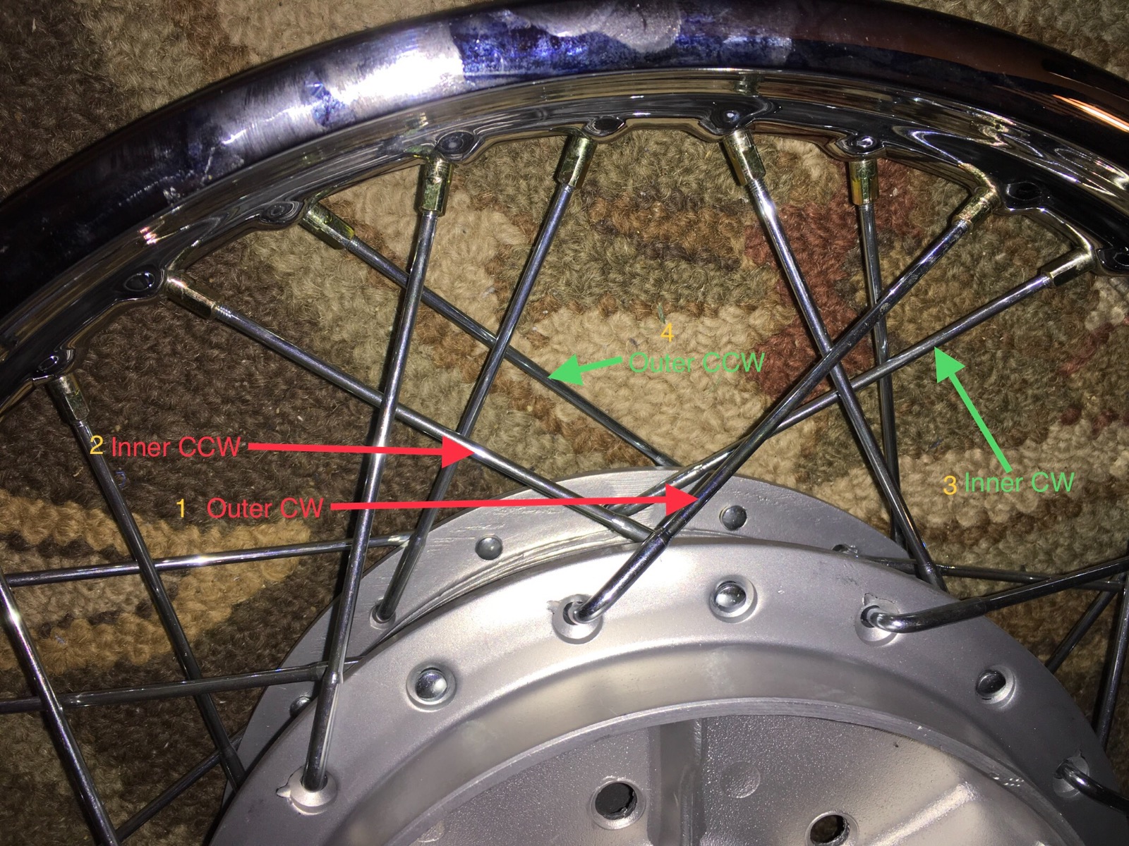 HRM, funny you mentioned follow the old marks on the hub. I did that for almost 3 hours and it was an exercise in insanity. Trying the same thing over and hoping for a different result. I almost gave up. I had the front wheel to set beside the rear as a guide. Trying several times it seamed like the rim spoke dimples were backwards. I could get one side correct but the other the spoke were opposite of the dimples. Finally I gave up following the old marks, and just followed the pattern of the front wheel and everything aligned. I’m at a loss on how this happened. One side followed the old marks and the other side ended up with the spokes opposite of the marks.