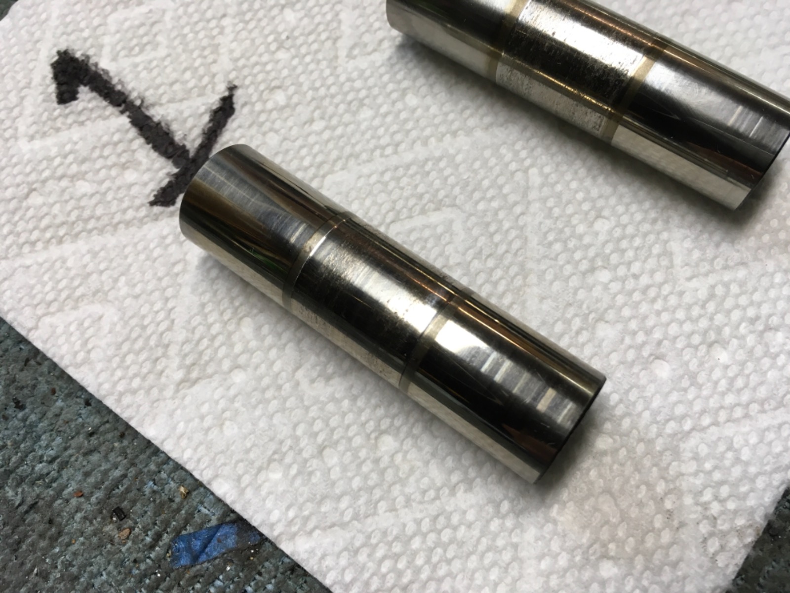 While I’m waiting on the head to be welded up the second time, hopefully I can profile the fins with the second build up and move on to the head rebuild. So I’ve taken to getting lower end parts out and inspecting them pre build. A quick reminder of where I’m at. The engine I bought for this build was an early ’76 without the oil volume cast into the upper case. It’s an unknown to me. Upon tear down it looked good but I didn’t dig deeper than the cases. They were my concern at the time so I could get them out to be vapor blasted. I did notice the pistons were 70mm wiseco. I didn’t want to use them so I have been searching for a good 66mm OEM set. I found them but no wrist pins included. I thought no problem I can use the pins I have out of the Wiseco. I dug the pistons up this afternoon and not pleased with what I find. The pins appear to have metal to metal transfer or gauling. I need advice please. I can get new pins but what if anything needs to be done to the small ends of the rods. Obviously I need this corrected before I build the lower. The backyard mechanic in me checked out the rod small end with my pinkie and it feels smooth but at the oil holes, the edges feel sharp. #2 appears to be the worst.