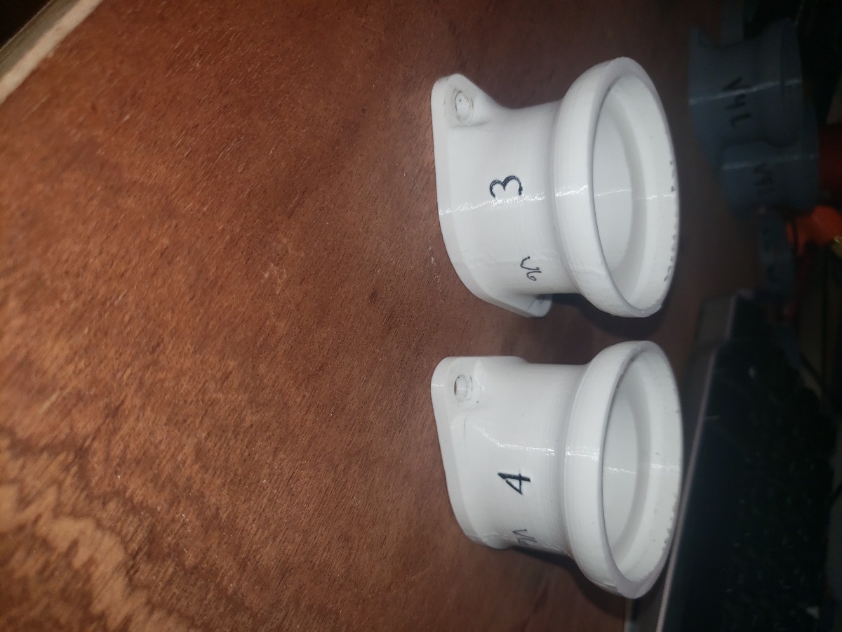 For V4, I re-added the eccentric opening for the TB, made the adapter taller to better accomadate the fasteners and allen keys to reach them, and then made generic Left and Right versions of each TB adapters, because the eccentricity of the throttle body and perpendicular bolt pattern between engine sides means that they'd need to be different. V4 was a success! Now to account for the different cylinder spacing vs TB spacing within adapters.