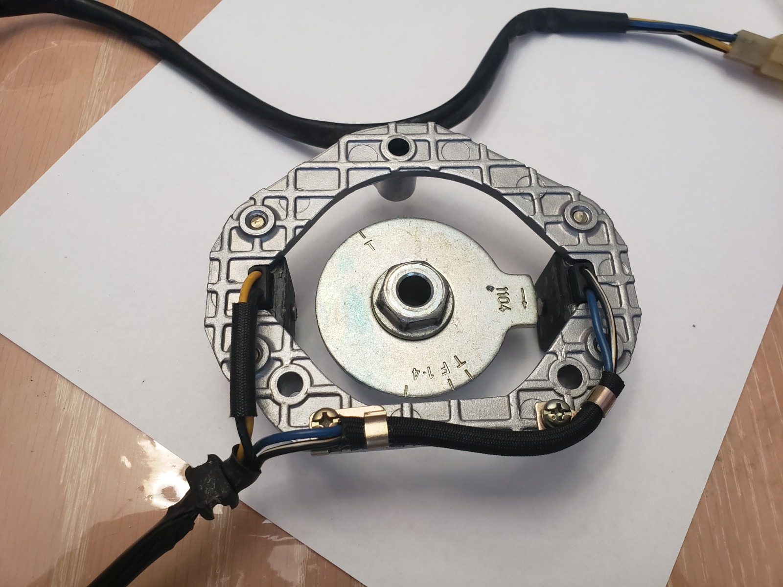 I measured the angle between T-F as 13.6-ish degrees and the distance between T and the third tick as 40 degrees on the dot. Pics below of the pulsing coil, VR sensors, and igniter. The igniter specifically isn't as described in my manual and was located near the neck of the frame as opposed to the below-battery position noted in the manual.