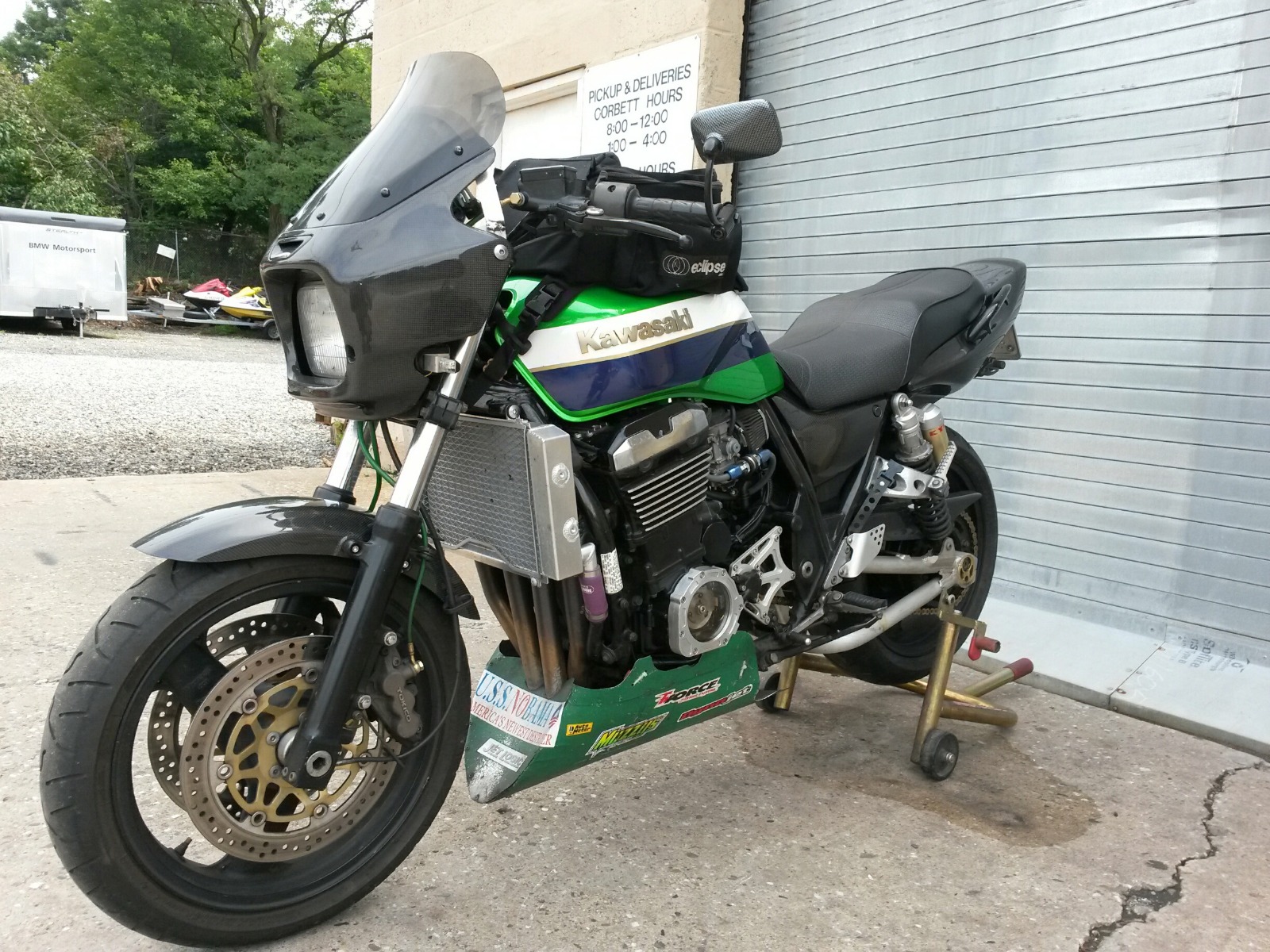 Hi Saablord, I've only got a couple of pics. It's a 1999 zxr1100. Full Muzzy Titainium Megaphone Pipe, Muzzy cams and selectable Timing gears. Dyna 2000 Ignition. Wide range heated o2 sensor for tuning. Lots of fun!! About 125hp if I remember. All the old plastic is now carbon fiber, while on vacation someone backed into the bike and the insurance payout was enough to get those parts! The exhaust note is so sweet it put this little guy to sleep!!