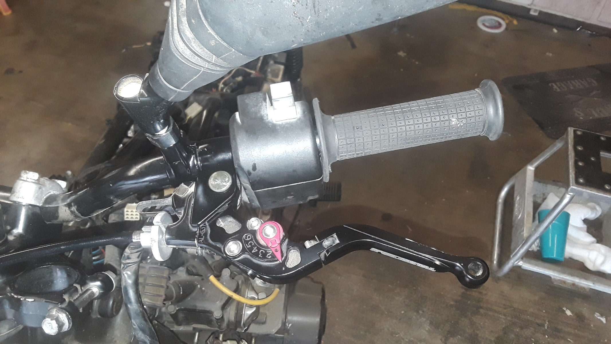 My wife has [strike]stubby little[/strike] shorter than average fingers. As a result she was attracted to my radial master cylinder on the Suzuki. After installing another radial master on her GPz with the adjustable lever, I found a matching clutch lever for her. She is pretty excited about it!