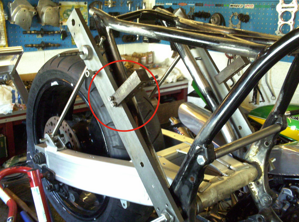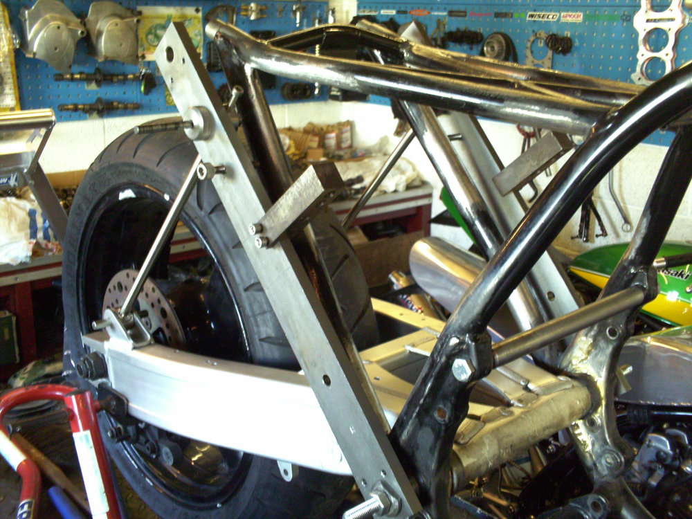 31 Mar 2021 16:39Maybe Accurate would have been a better description, did your "jig" incorporate the angled rear Frame down tubes across the frame? Your solution gives you the position but it still needs to be drilled dead straight across the frame... Does that make sense, Its hard to explain through typing....{maybe I'm getting to old !}You don't need a complicated jig to relocate the upper shock mounts but they are nice if you do this frequently. I made this crude jig to locate the upper shock mounts when i relocated them on my 750G. Triangulate the upper mount off the pivot and the lower shock mount. When I machined the mounts I had a 1/4" pilot hole pass all the way through so I could pass through some 1/4" rod side-to-side to make sure the mounts were on the same axis. Their location is just as exact as the stock mounts, if not more so.