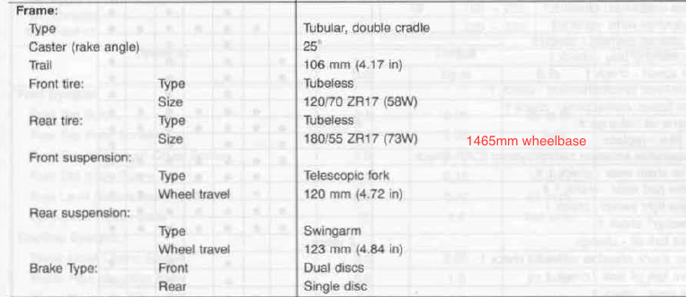 These ZRX 1200 dims are all I have. I believe the 1100 has a slightly shorter wheelbase and some other small changes. These numbers are what I based my target on. I rode a friends ZRX1200 and was impressed with how it handled. I figured that was a good goal to aim for since its overall design and construction is similar to the KZ.