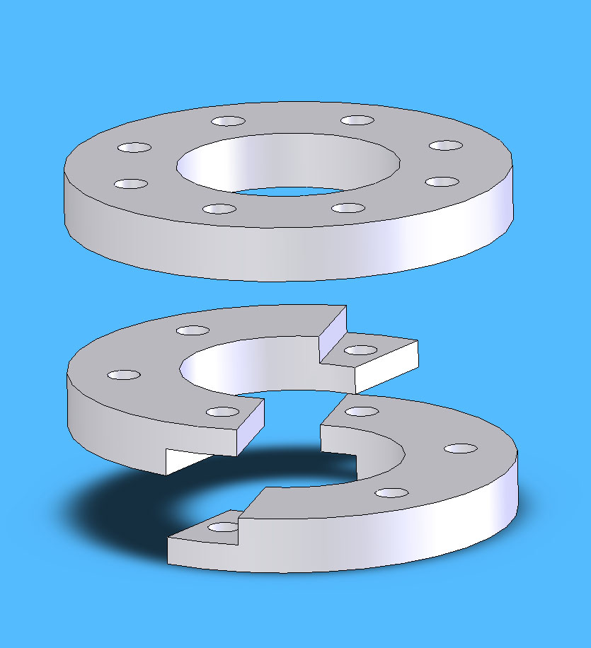 The picture below shows what I'm thinking. The two piece split ring goes on the inside, the full ring goes on the outside, and you clamp it together with bolts.