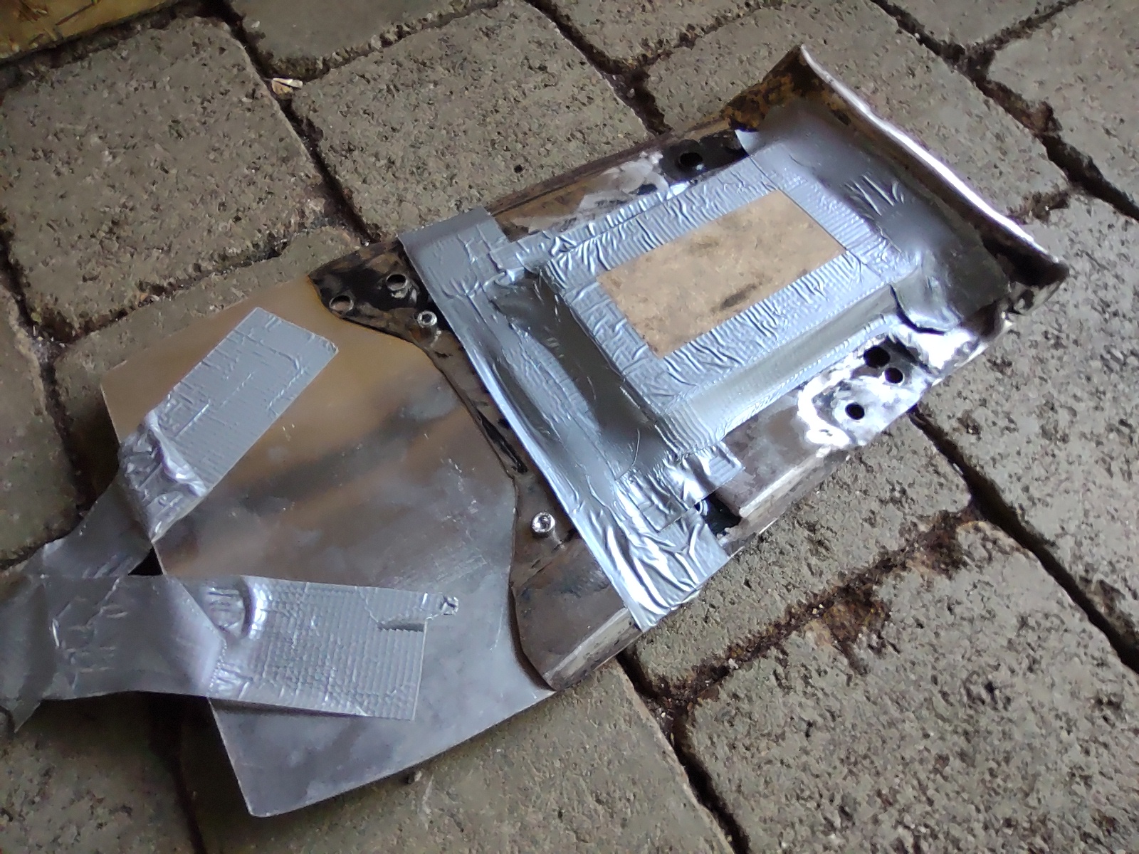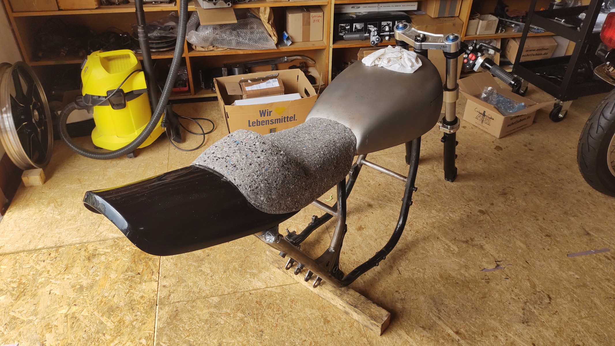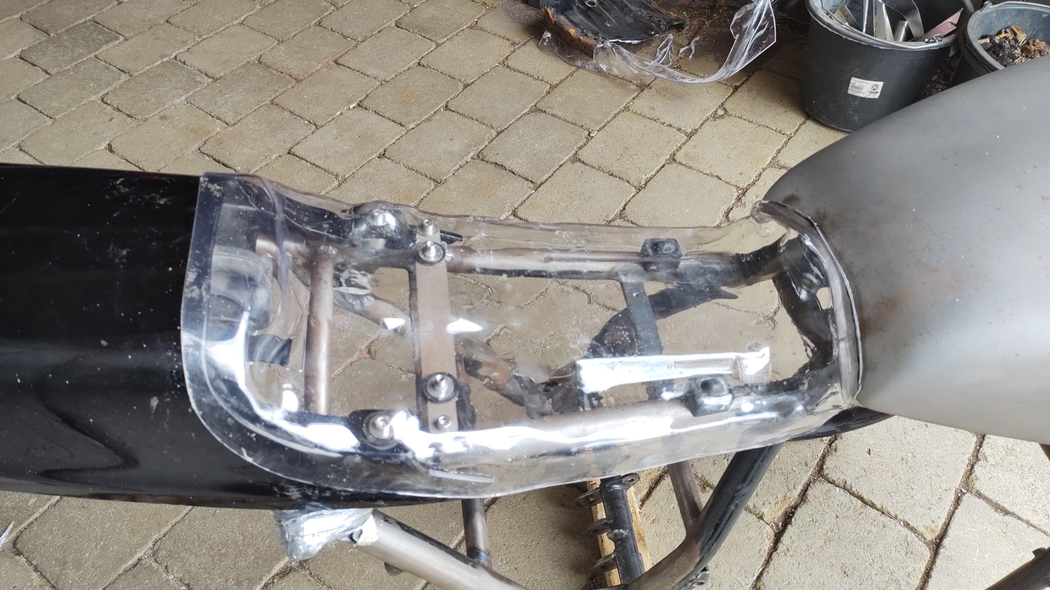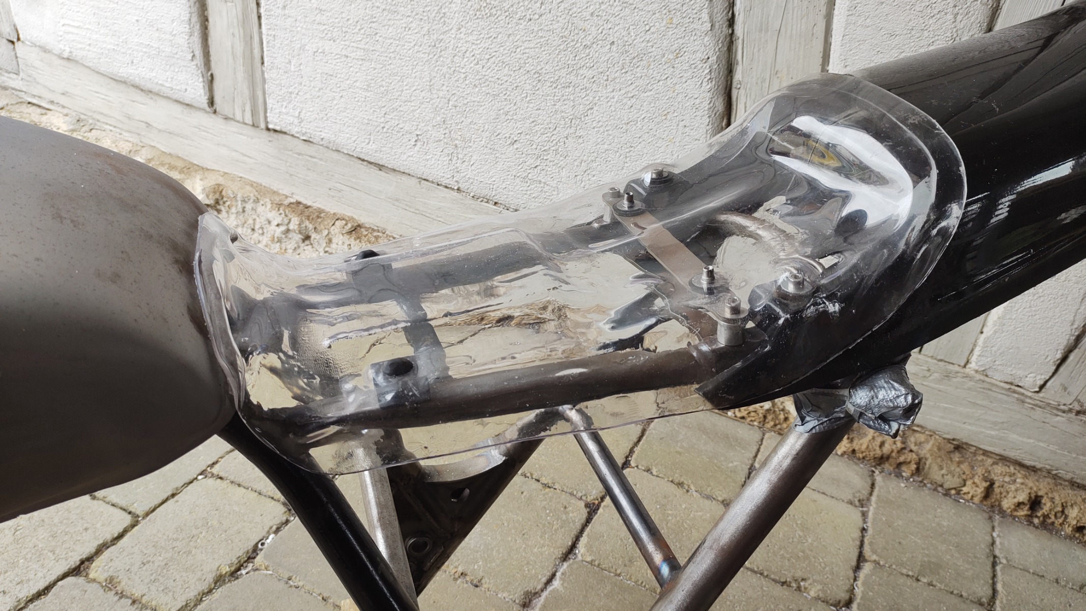 I cut up a rusty seat pan and screwed a bit of aluminium to it. I used the stock rubber dampers and duct taped the whole thing to the tank and tail section. I also duct taped a few things to the pan to make room for wiring etc. Using the heat gun the Vivak just sort of melted on to the pan, tank and tail section. After that I added a few more recesses with a bit of steel bar and carefully applied heat.