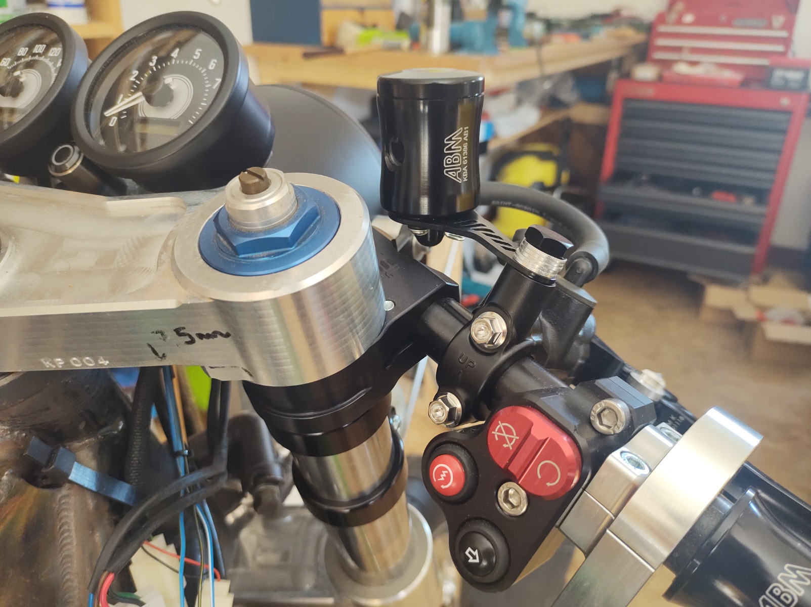 Got the front brake reservoir mounted today. Need a different bolt for the bracket (just used a banjo bolt with a load of washers to get the position sorted). Also shortened the oil cooler lines so they sit a bit closer to the engine. Ordered a 135° fitting for the rear to take the kink out of the hose. After that I started sorting out the wiring for the rear indicators - will get them fitted tomorrow and post some pics.