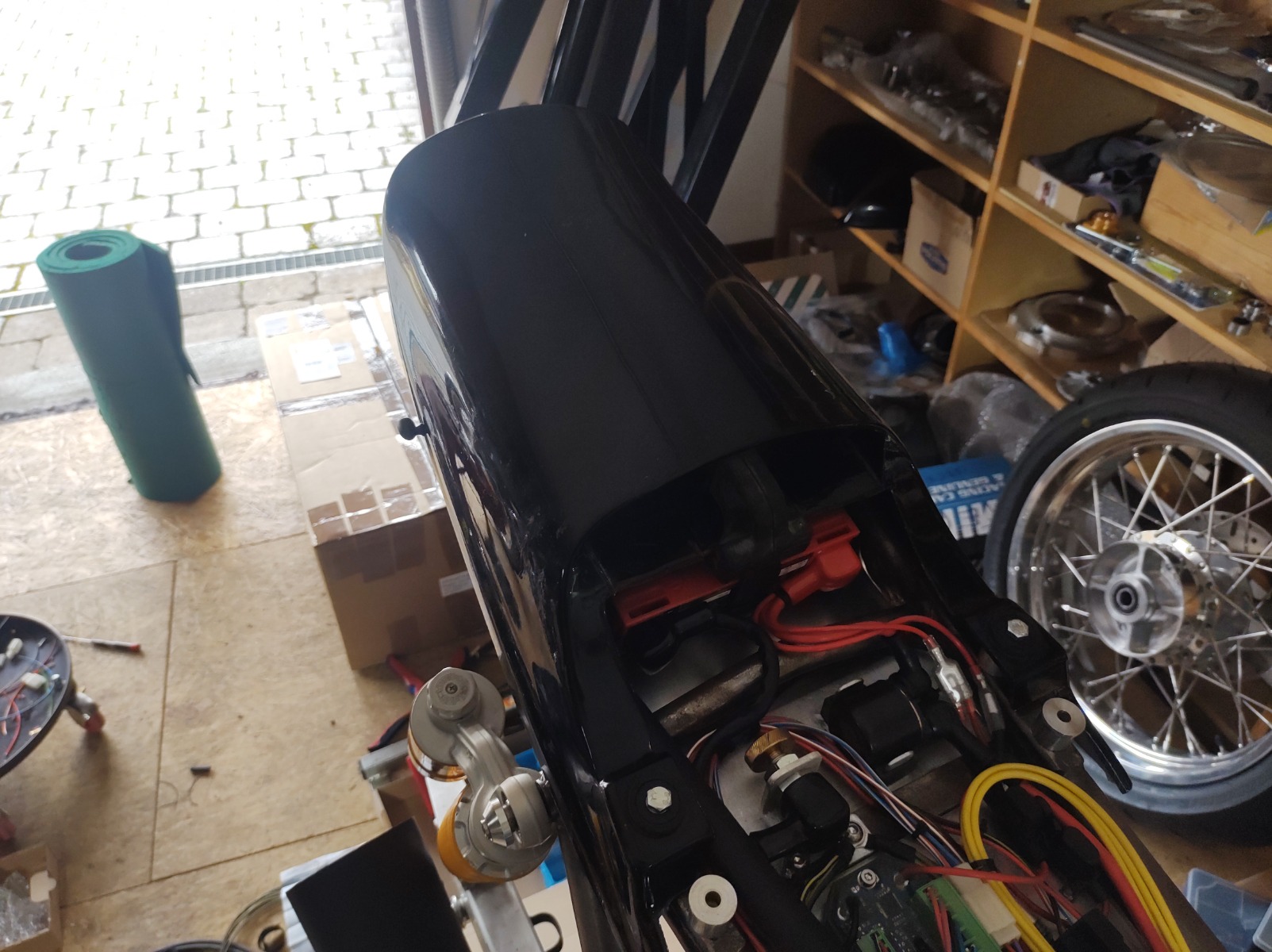 First day back on the wiring. Got the ignition relay done (the mini motogadget relay with an extra fuse). Got the crankcase breather connected up - there wil be a catch can under the tail. Also connected up the oil cooler hoses. Have left enough room to move the oil cooler out a bit but I need to shorten the lines slightly so they run closer to the engine.