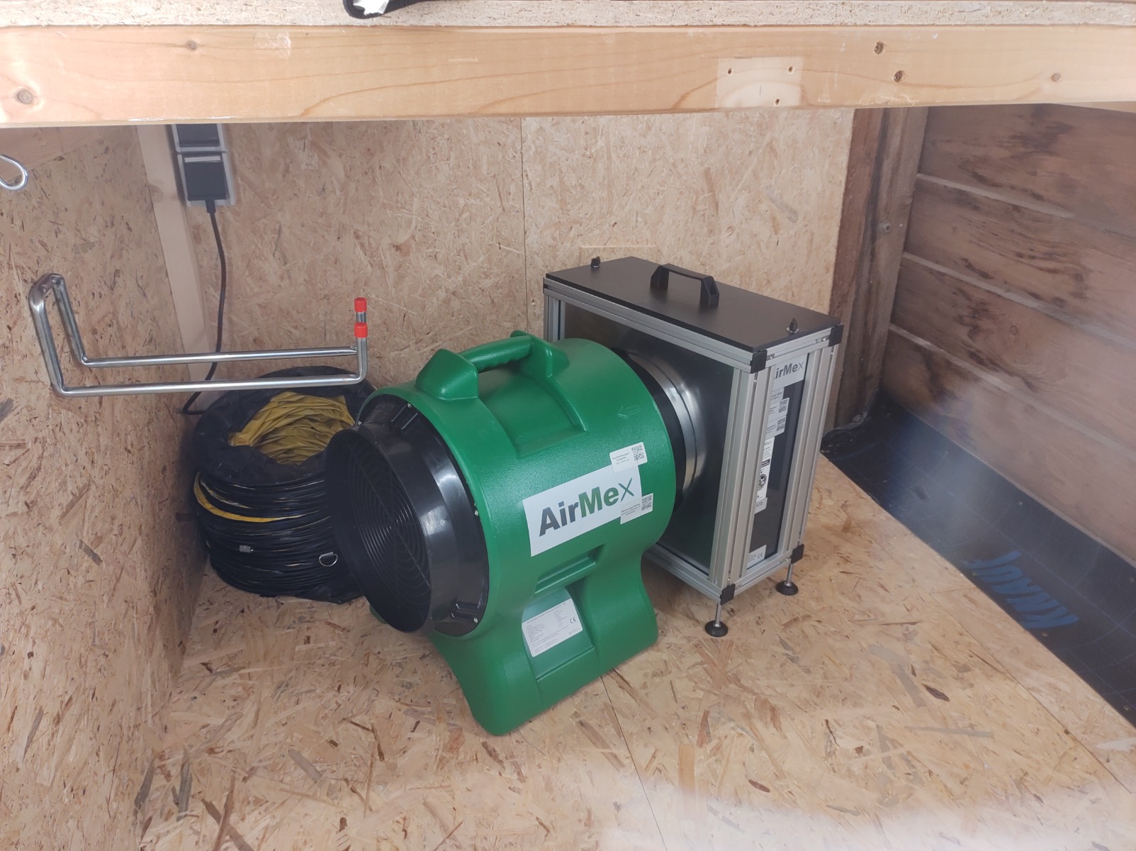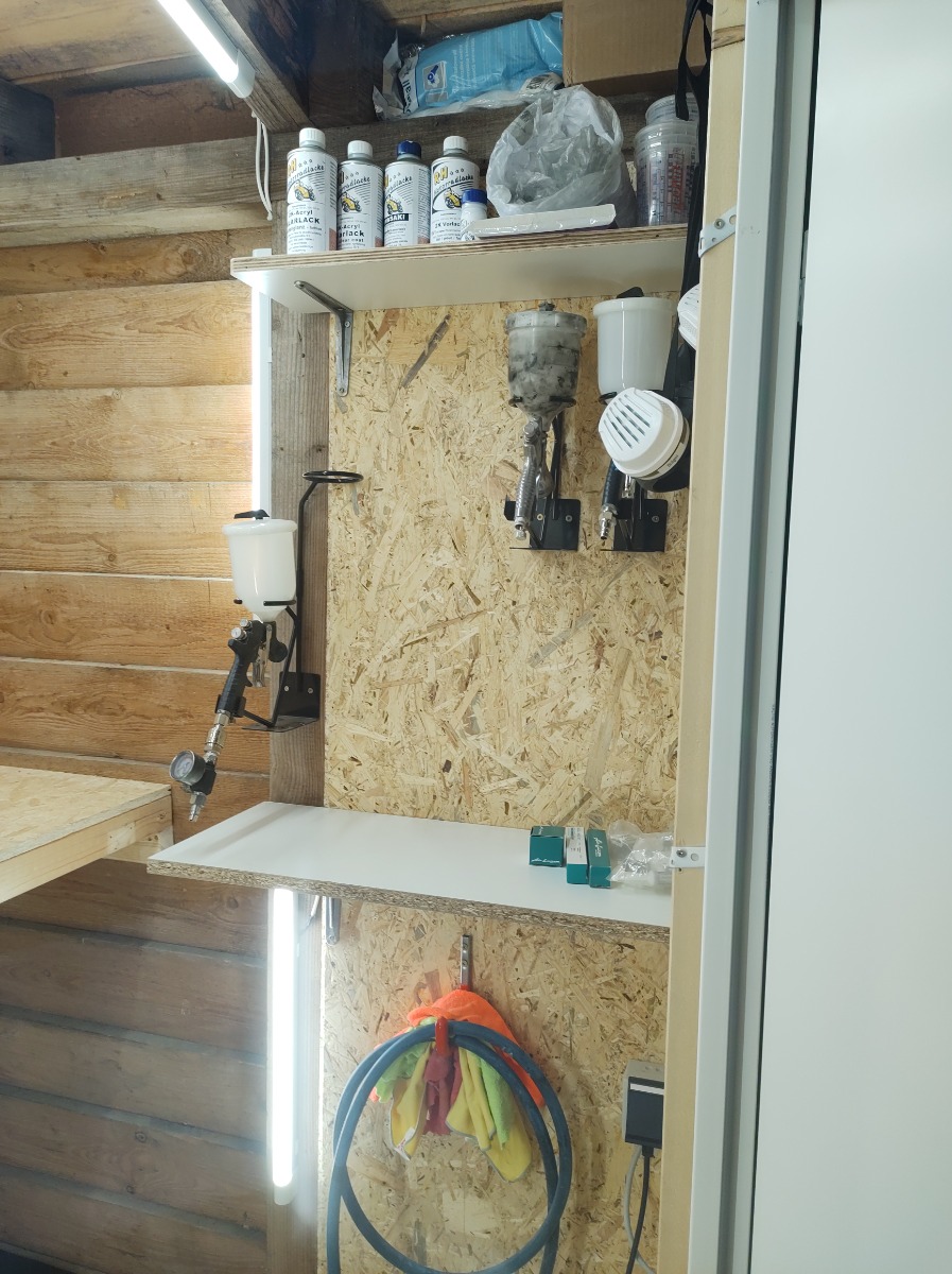 After a lot of work getting the kitchen finished I still haven't got the foundation for the workshop done. I figure it will be a while until I can get it finished so I used some leftover wood to make a small spray booth in a corner of the carrport. I used the door, lights and ventilator/filter that I had for the workshop, Finished making some shelves, a drawer for the spray gun parts and a couple of turntables today and now it's ready to use. As soon as the temperature goes up a bit I'll get back to work on this build.