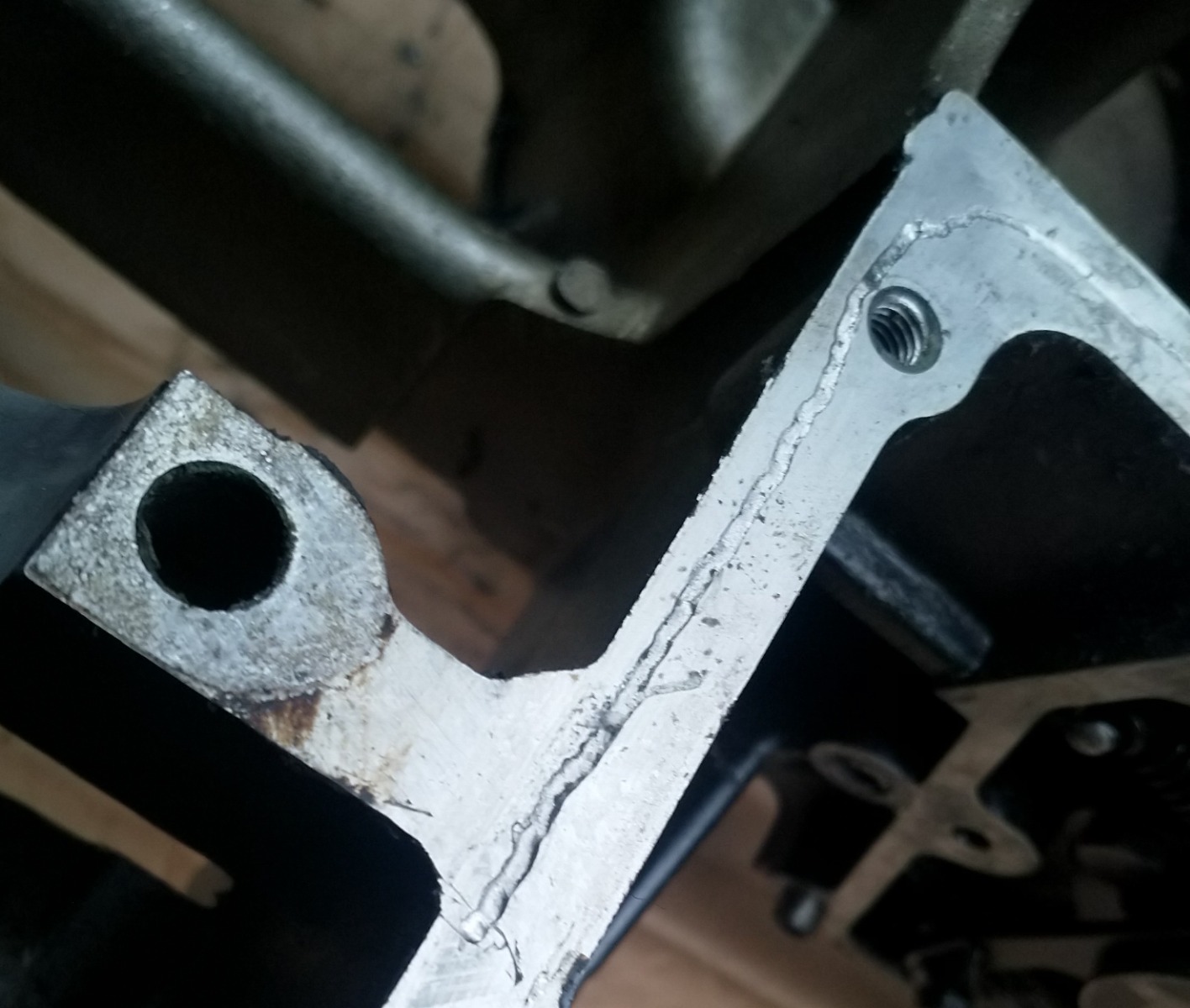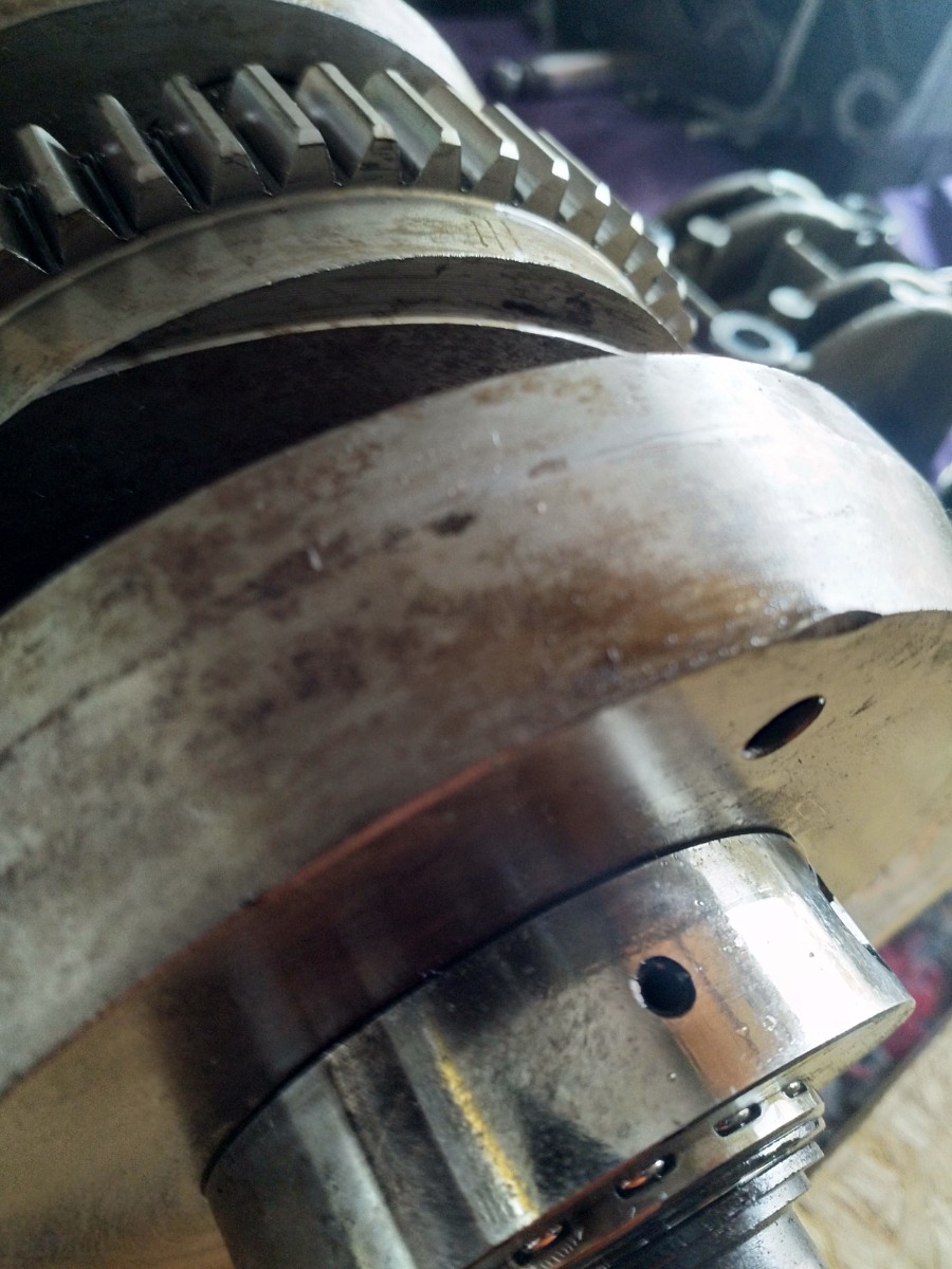 That wasn't a crack on the case, just a deceptive bit of dirt! That doesn't really help, though. The broken bit looks like it has already had a dodgy repair done. The side on the crank next to it wasn't marked or scored so I assume the bit that broke off didn't fall into the case as it was running. The crank does have a bit of a dent on that side but that would have required impact with something substaintially harder that aluminium. Other than the gouge out of the mating surface there was also a helicoil that had wound itself out of the hole and the oil pump gear had also made a nice groove for itself in the lower case. The dodgy repair is enough for me to ditch these cases. I have a good set for this build so I'll just keep an eye out for a new set before I start with the next project.