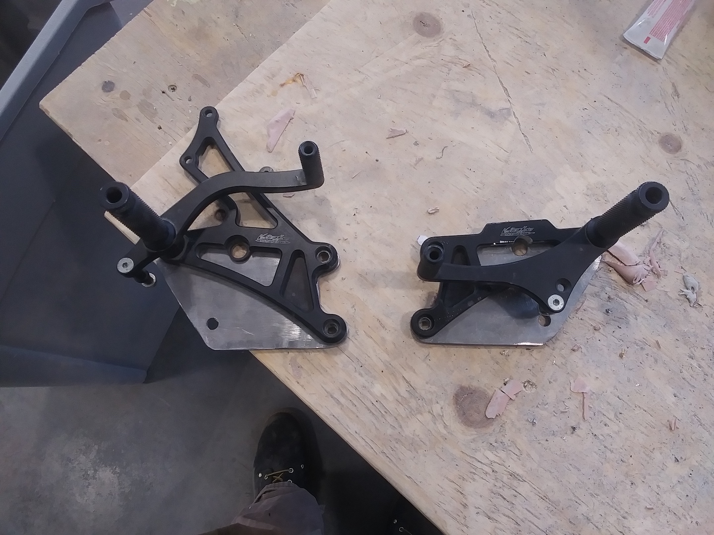 I've had this set of Valter Moto rearsets hanging around for years—somebody bought them new and decided he couldn't use them, so he put them on Ebay for $50. I bought them, figuring I'd find a use for them eventually. Here they are on the mounting plates: