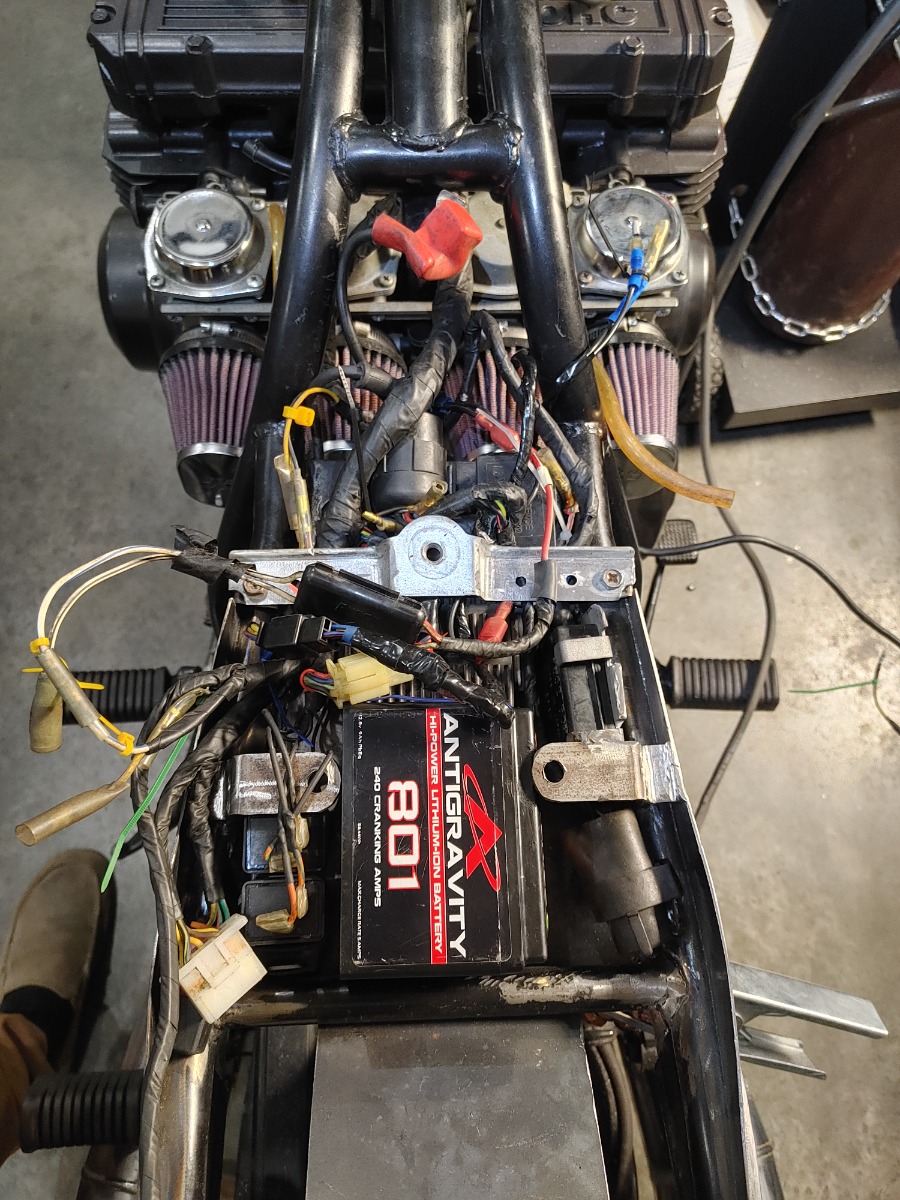 Ordered a custom seat from Tuffside seats in Las Vegas. Highly recommended. Chopped frame, added LEDs, mounted gsxr forks, powder coated matching 18x2.15 front rim, installed ricks regulator, 8 cell Anti Gravity battery,