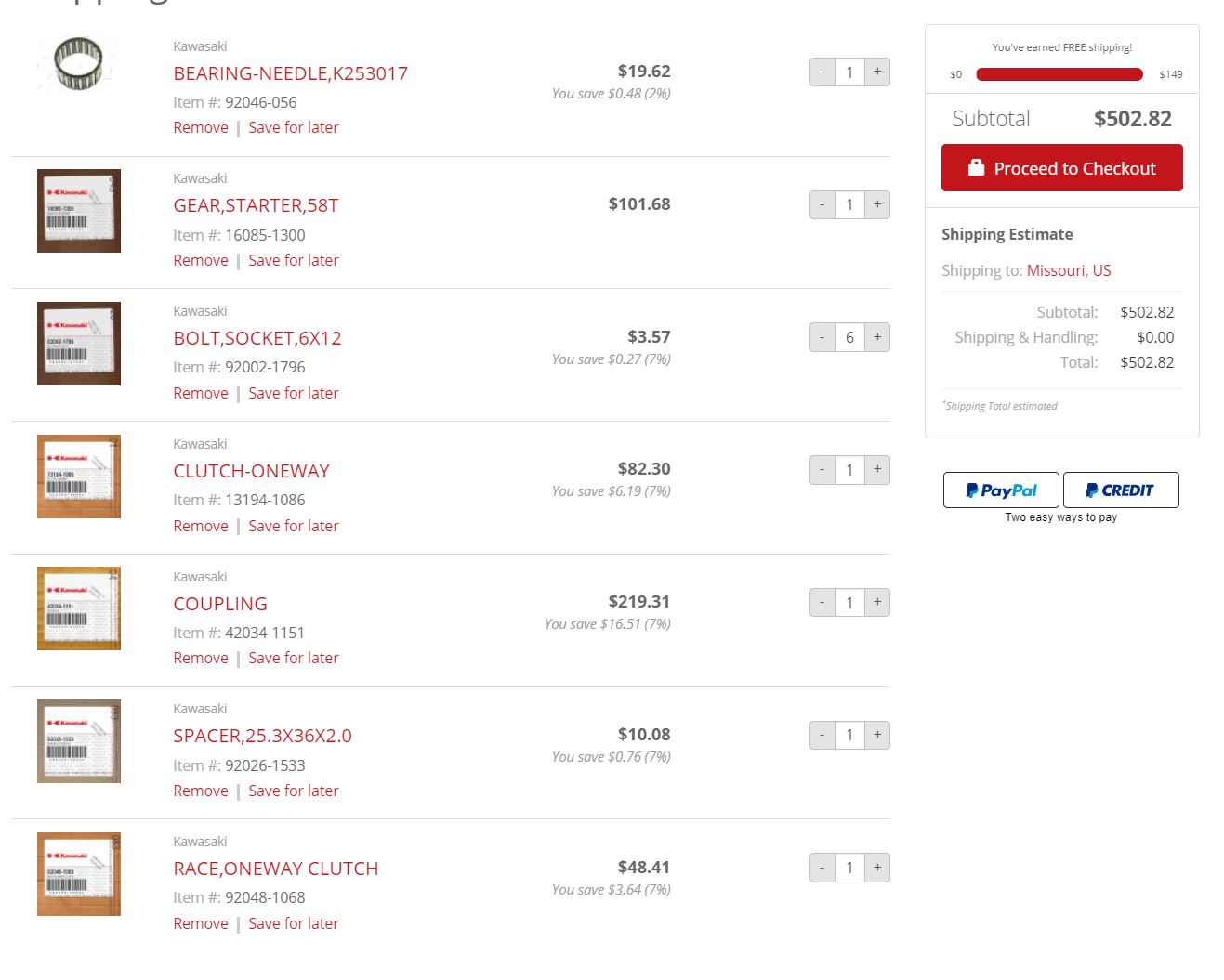 12046-1032 sproket......... 131930-1012 one way assembly........ bearing same.... 3- 120po812 sproket bolts..... thrust washer and locking nut for the clutch. Stock set up check around check ebay Cheap Bike Parts, Partzilla. Less than 200 when I did it........... Like the idea of the ZR7 set up too if you can fine a nice used one.