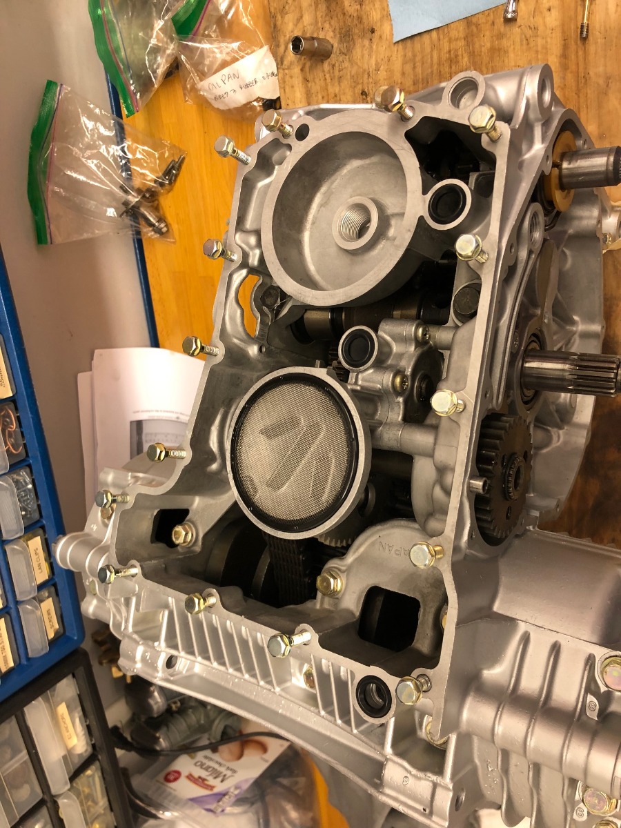 Oiled for proper torque. Bottom assembled and engine flipped upside! Almost done (bottom end)