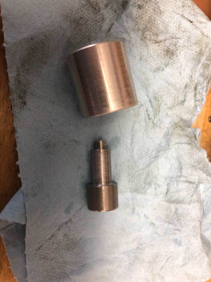 More progress. Liked idea of using cap hole as a guide. Machined aluminum bushing and press adapter to fit tight and stop when correct press depth achieved. ID of bushing is just right to fit new valve guide.