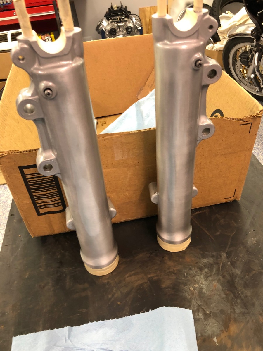 Some updates. Picked up parts from vapor blast. I asked him where he felt like coating was applied. He said front hub?? He didn't feel like forks had clear on them (but I can tell there was). So now I still have dilemma on what to do with hubs. On forks, I used 3m pad to bring back factory-like shine and going to clear coat them.