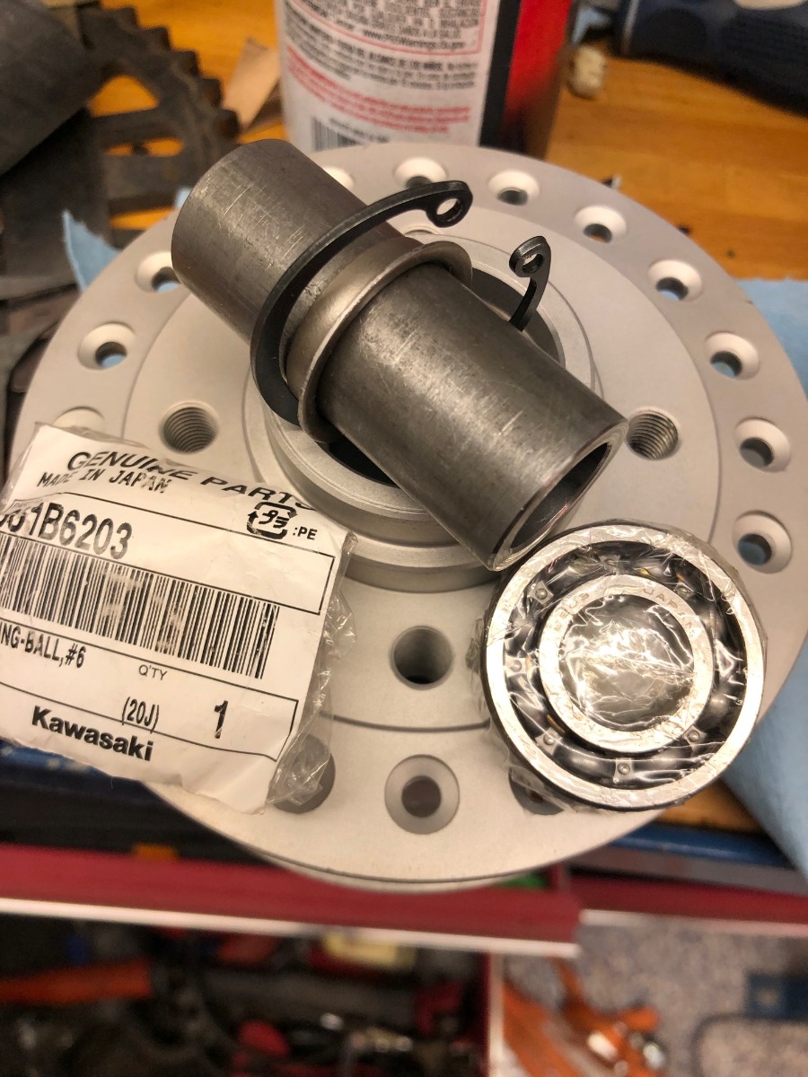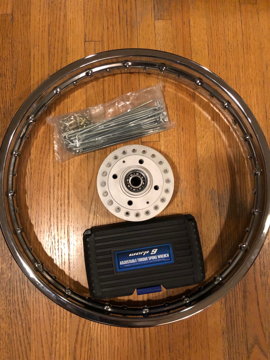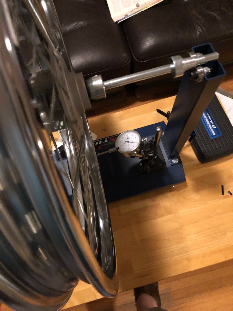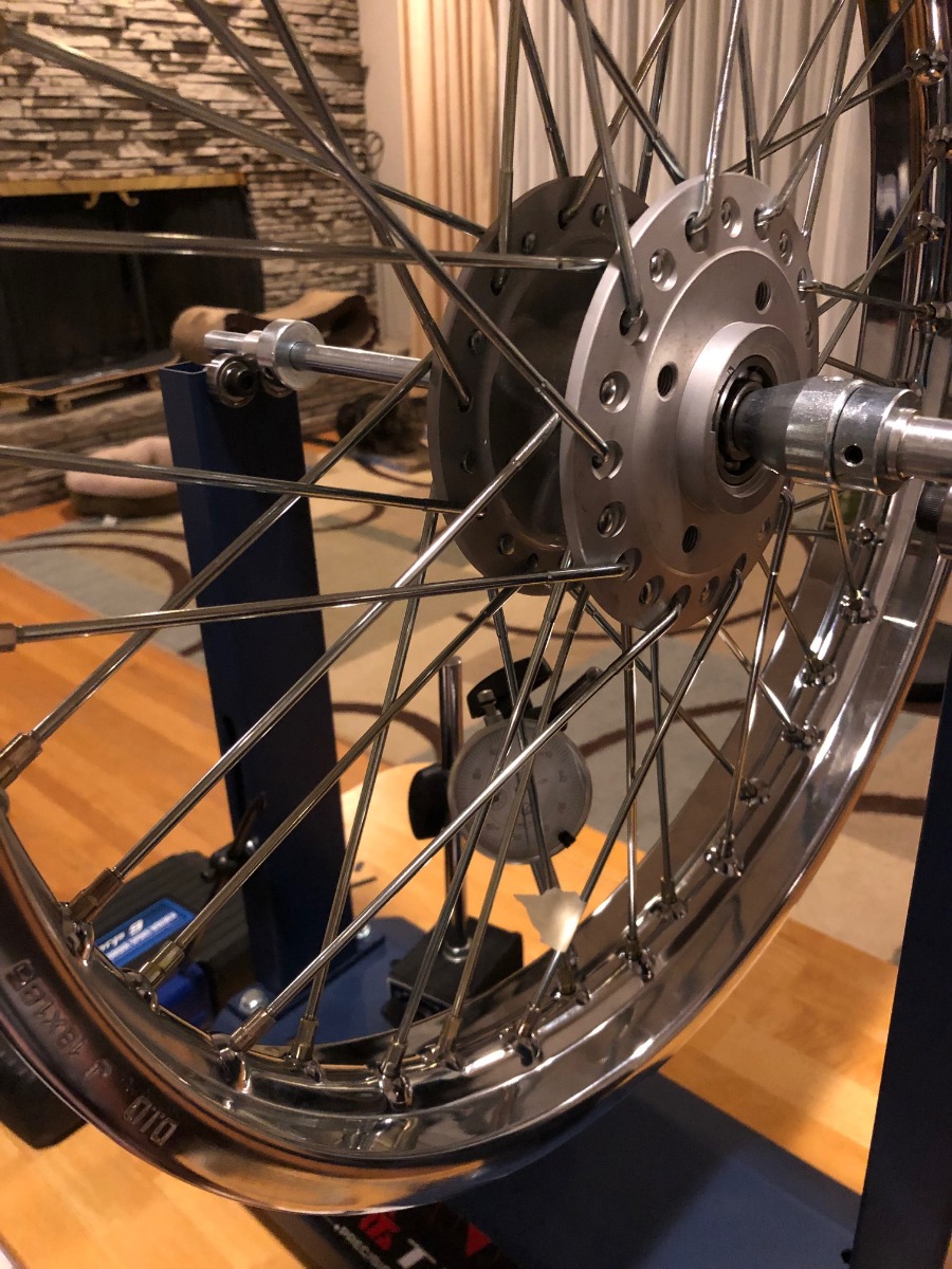 But, Parts clean, can work in living room. Front wheel assembled. New OE bearings, new DID rim, new spokes. Of course I messed up first time, but got it right (2 pics showing right/wrong)