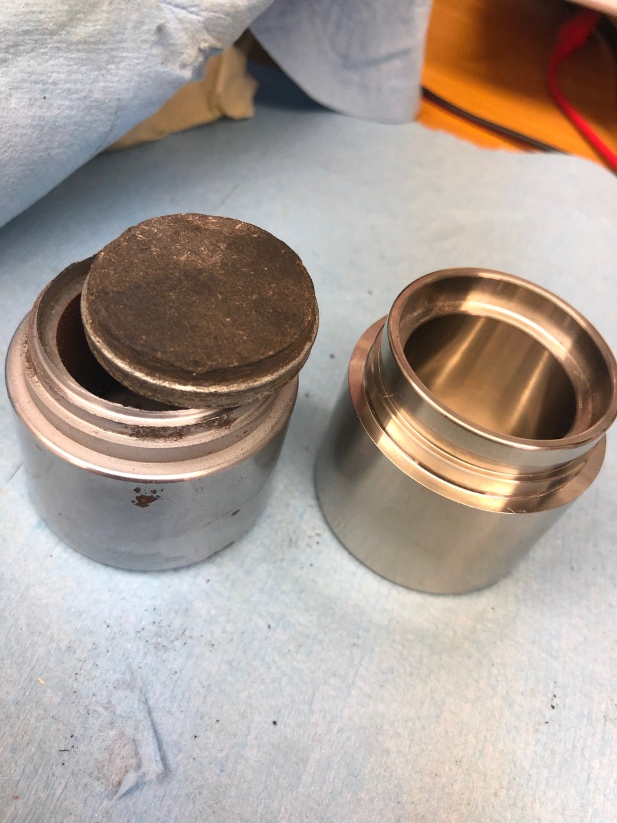 Received caliper kits. I guess there is good news. Pistons completely identical, they just miss inserts. I carefully cut a lip on a lather to remove those pads.