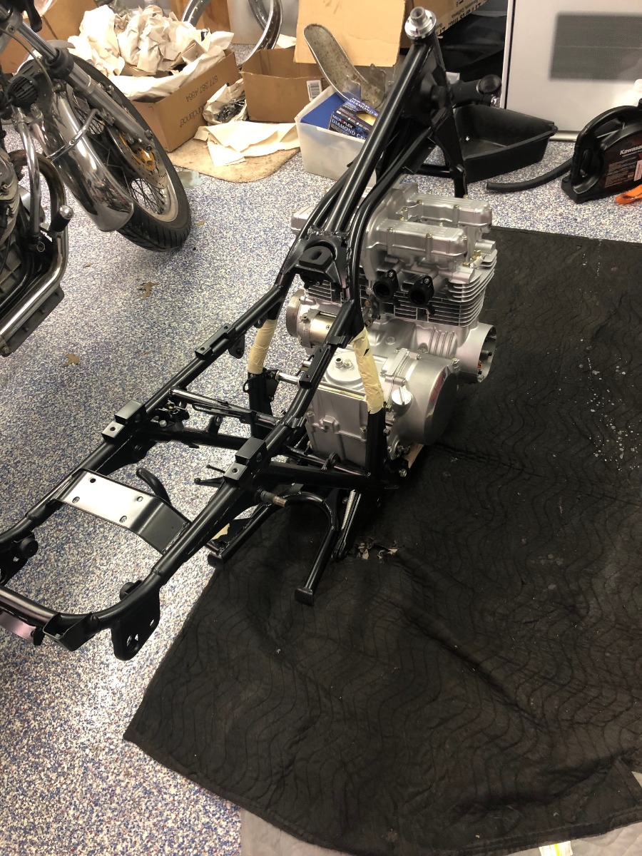 Aaand done. Since nothing was really assembled, I quickly got back to frame. Layed engine on side, prepped hardware. Wife with daughter held frame over and I got it positioned. Then I put it upright, used engine hoist once again to lift by the frame and got rear wheel and forks installed. Back on a lift!! They only "gotcha" - got those wire clamps bent, They probably wasn't correctly installed.