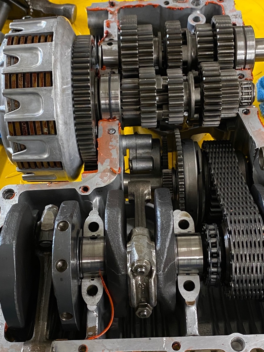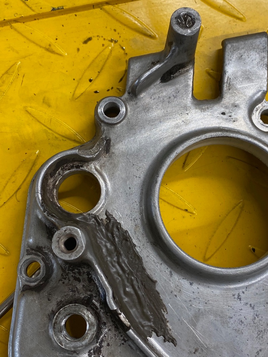 There has been some damage to the tranny cover...possibly from a snapped chain. At some point some PO tried to repair it to prevent leakage. I need to strip the repair and examine the crack to see if it's OK, or maybe try to replace the cover. If you look closely you can also see that the top bolt on the sprocket shroud was snapped off. Also, when removing case bolts I noticed that one was broken on the threads, so will have a stud to remove when I get the cases apart.