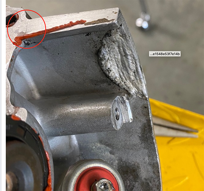 Photos below show another, more serious problem. The engine case is cracked on the left side of the lower engine mount. One photo shows if from the side and the other from the bottom. Any opinions on whether this is weldable? I may have to scrap the project if it cannot be properly repaired. I have the cylinders off and they look OK, as do the pistons, but still need some measurements to ensure everything can be re-used.