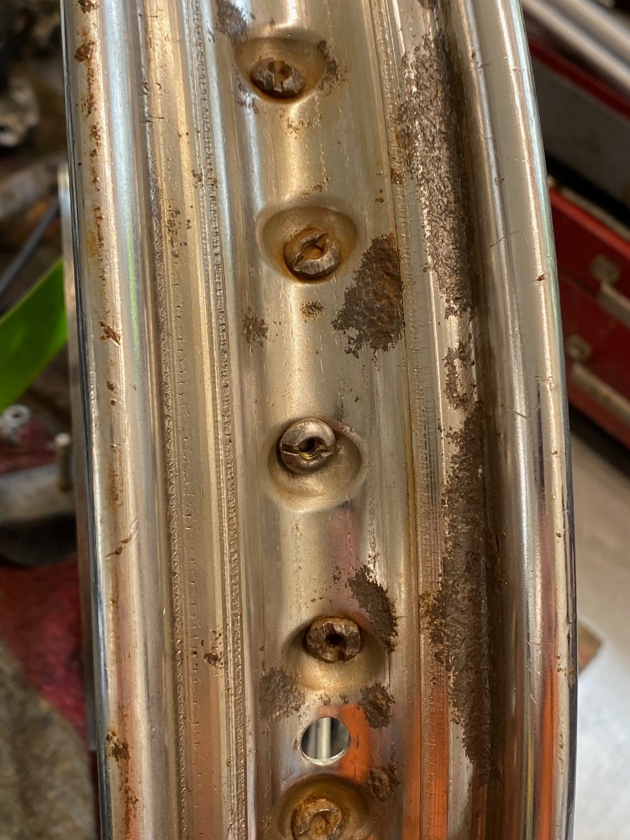 Wheels are back from the Kawi dealer, where I had them dismount the tires. These are original rims but painted black, so I have some work ahead of me to clean everything up. Right now I'm pulling the spokes and cleaning them one by one. The rim chrome looks alright but there is rust inside along the tire bead surfaces. Only surface stuff, but still rust that must be cleaned up. I'm thinking of dunking them in metal rescue to fix the rust but interested to know if anyone has tried anything else?