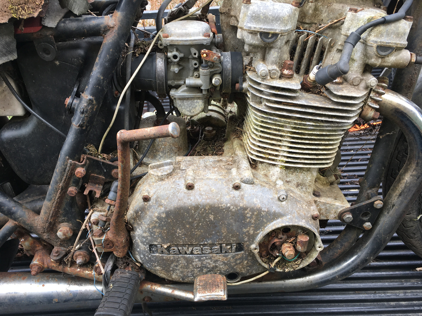 After talking to a guy in Canada about the KZ750 twin he races I have decided to build an all out track/race version of my own. I have been slowly accumulating parts for the engine and recently picked up a complete chassis for the build. Its the roughest bike I have ever bought. Literally everything, except the frame and the engine cases, will be sold or junked.For $100 with a title I don't think I can go wrong.