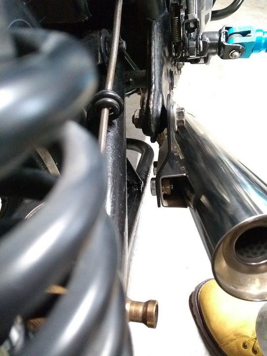 Was having contact between the swing arm brace and muffler mounting bolts.