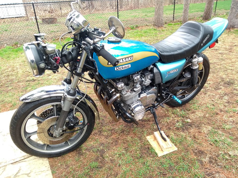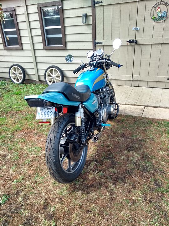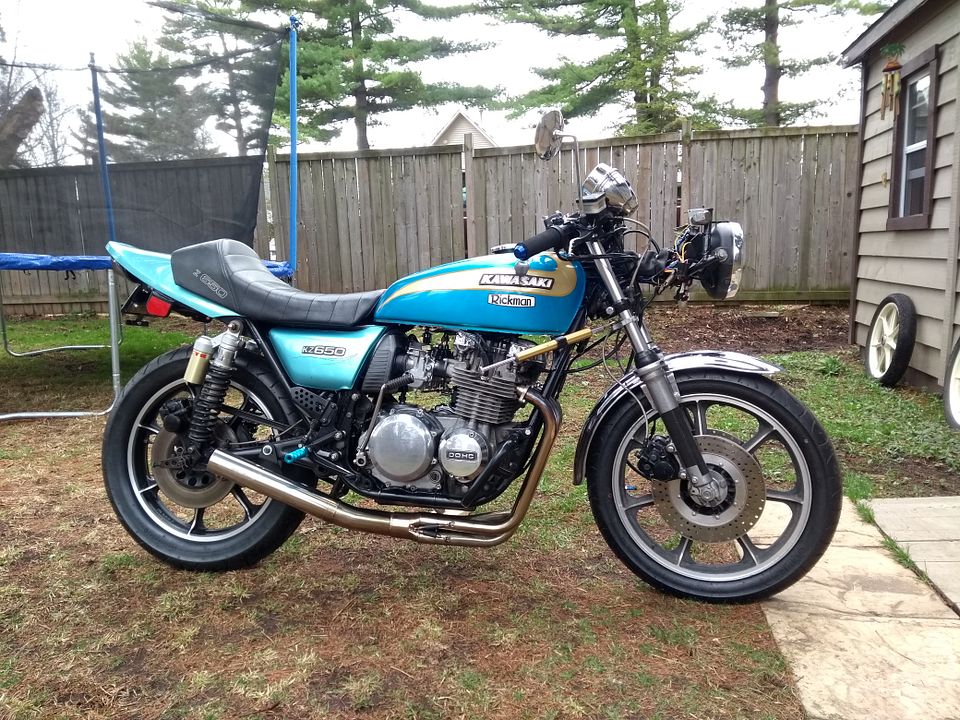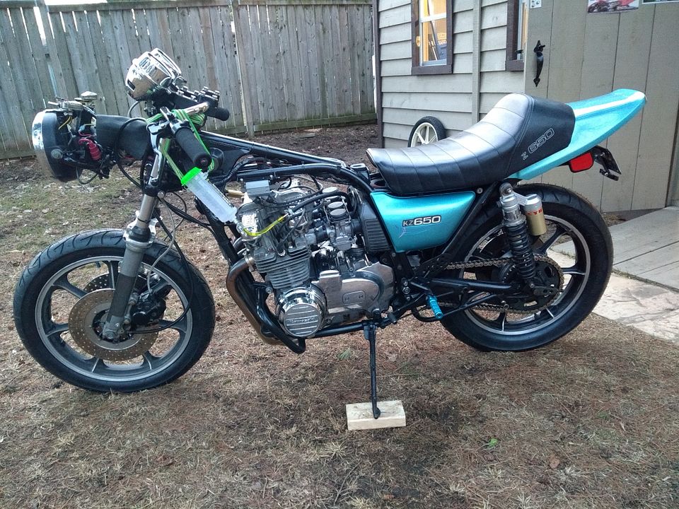 1978 KZ650 C2, 130K kms, Delkevic ex, EI, CVK32, PMC easy clutch, ATK fork brace, steering damper, braced swingarm, ZRX shocks, 18" Z1R front wheel.