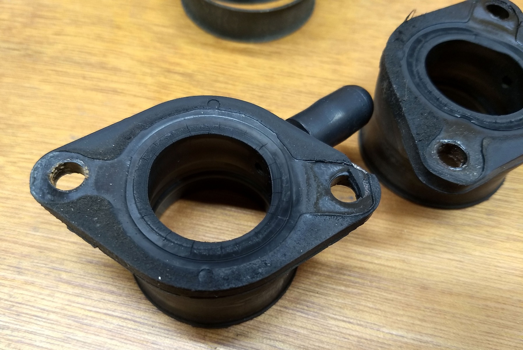 The first thing I did was pull the carbs and the boots. The boots definitely are dry and cracked, and the carbon deposits on the face of the intake port sealing surface make it look like it was definitely not making a seal.