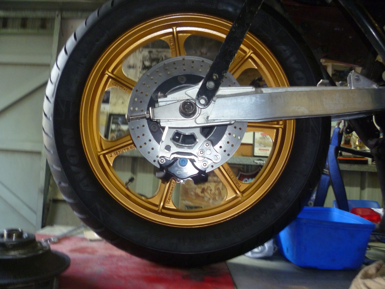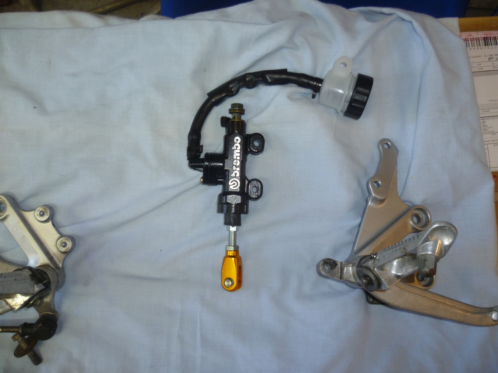 Went through the parts stash and pulled out some more parts I'll be using. I have a nice billet underslung brake caliper mount that has been paired up with a Caliper I bought online, If you look hard enough you'd be amazed what you can find. The caliper is 6061 T6 Aluminum, all pistons pads and seals are the same as the Brembo P234 super sport calipers, actually, its a direct copy, only the bolts differ, the P234 calipers sell for around $700 dollars here in Australia.I also have a "brembo" master cylinder to match. I also found a set of rear sets I've had stashed away for over 20 years, can't remember what they are off but I remember buying them because they were basically symmetrical. I threw the calpier and mount on just for a look.