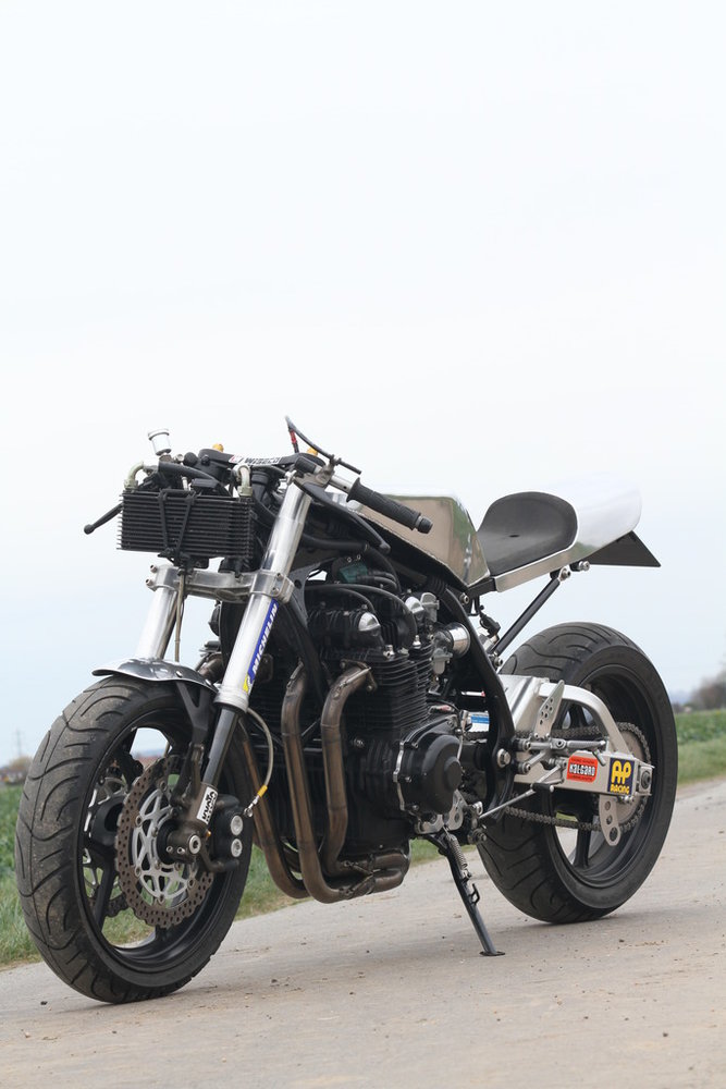 1978 KZ650 C2, 130K kms, Delkevic ex, EI, CVK32, PMC easy clutch, ATK fork brace, steering damper, braced swingarm, ZRX shocks, 18" Z1R front wheel.